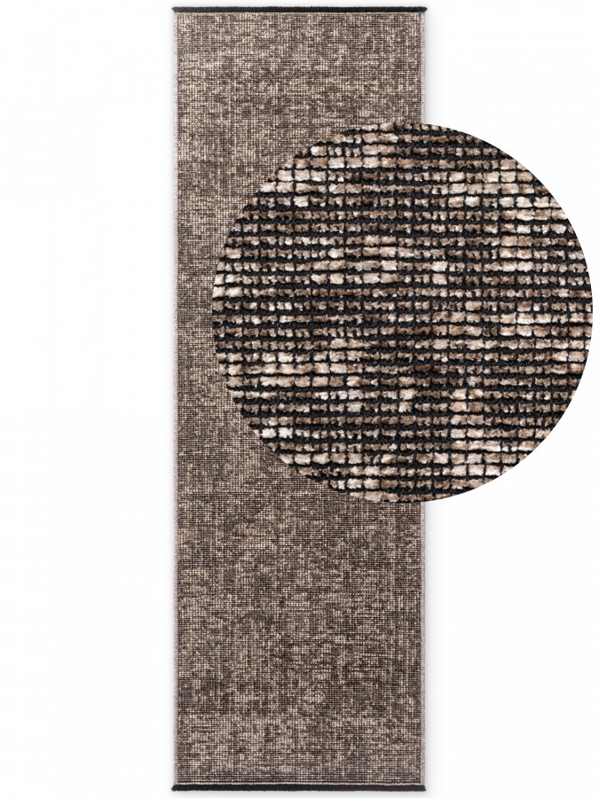Hnědý běhoun s jemným béžovým nádechem působí jako měkký obláček, který se usadil přímo na podlaze. Jeho povrch s nízkým střiženým vlasem vytváří drobný mozaikový efekt, který se rozzáří při každém světelném záblesku. Na kratších stranách ho ozdobně rámují třásně, které mu dodávají veselou náladu, zatímco delší strany jsou úhledně obšité pro dokonale čistý vzhled. Díky odolnému a snadno udržovatelnému materiálu si udrží svůj půvab i v živé domácnosti plné každodenních dobrodružství.