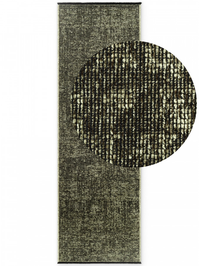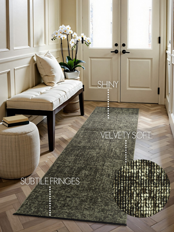 Zelený běhoun působí jako svěží závan přírody, který vnese do místnosti lehkost i příjemnou energii. Nízký střižený vlas vytváří jemně třpytivý efekt připomínající sluneční odlesky na listech, takže povrch působí živě a proměnlivě. Na kratších stranách se houpou elegantní třásně, zatímco delší okraje jsou pečlivě obšité pro čistý a upravený vzhled. Díky odolnému a snadno udržovatelnému materiálu zvládne každodenní provoz i zvědavé dětské kroky.