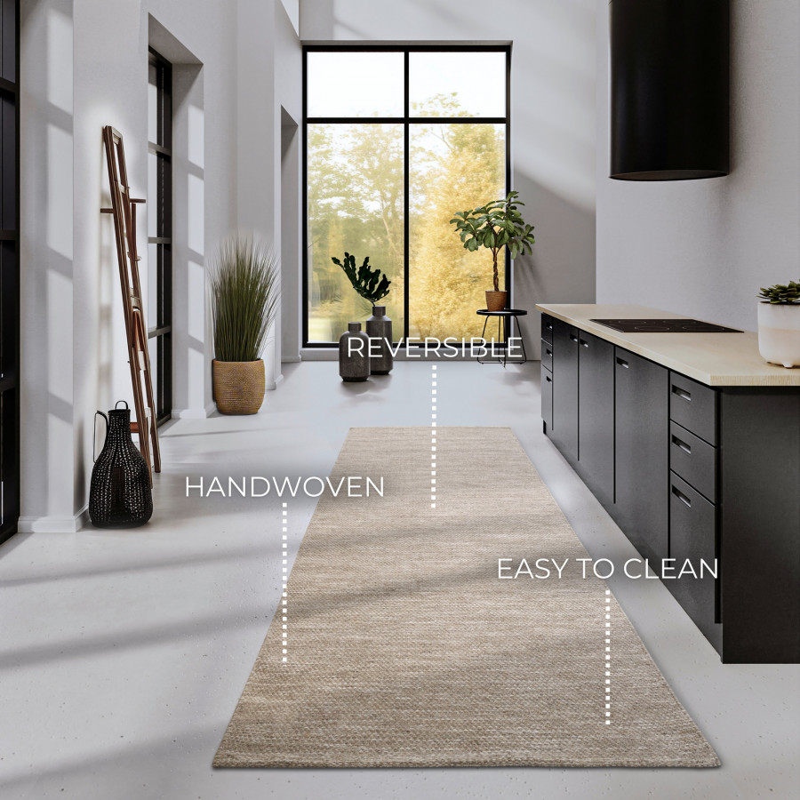 Světle béžový běhoun přinese do vašeho interiéru jemný nádech elegance a sofistikovanosti. Jeho středně vysoký smyčkový vlas zajišťuje příjemnou strukturu a odolnost, zatímco ruční tkaní přidává na kvalitě a pečlivém zpracování. Díky kompatibilitě s robotickými vysavači je údržba snadná a váš domov bude vždy vypadat bezchybně.