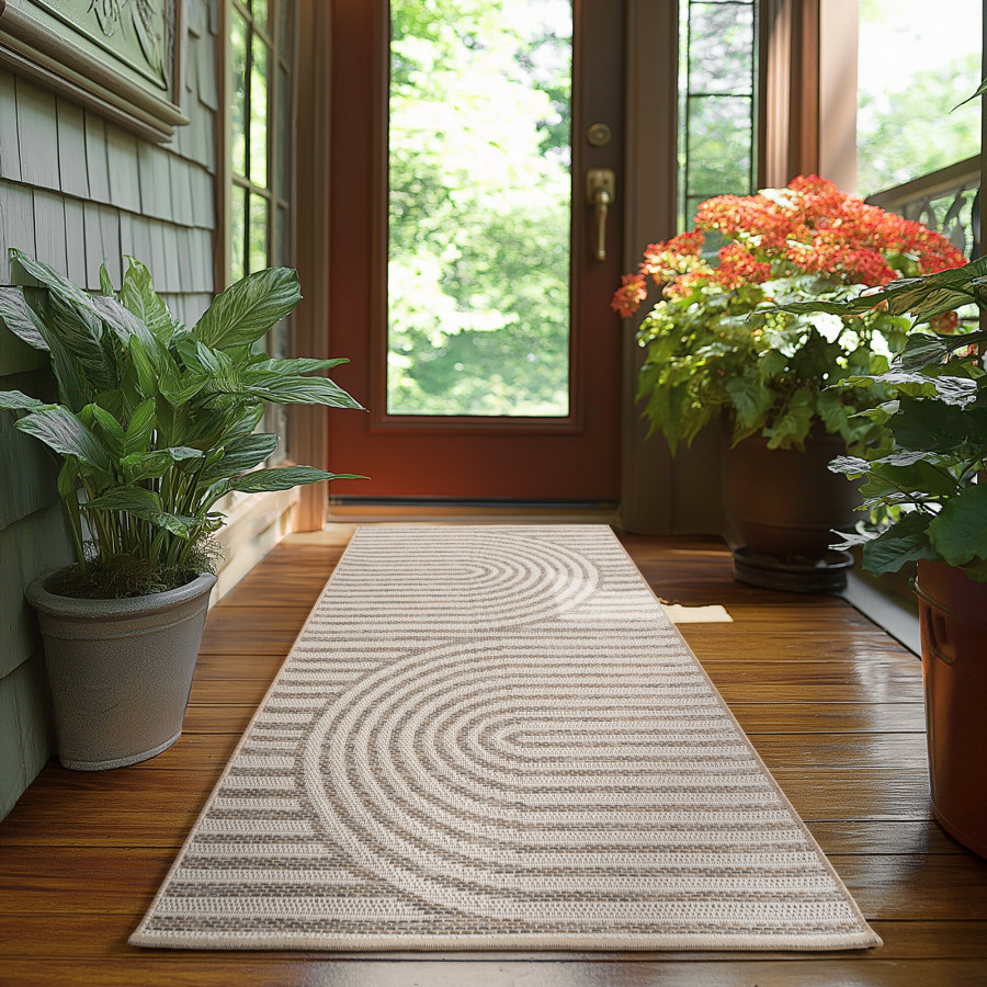 Běhoun Desert 1301 v béžové barvě a v obdélníkovém tvaru je vyrobený ze syntetického (vegan) materiálu, který je odolný proti skvrnám a nenáročný na údržbu. Tento běhoun udělá parádu nejen v dlouhých chodbách, ale i v kuchyni či ložnici; zjemní kroky, ochrání podlahu a opticky protáhne prostor. Geometrické vzory dodají místnosti strukturu a moderní charakter, aniž by prostor působil rušivě. Navíc je vhodný i do exteriéru, je kompatibilní s robotickými vysavači, je vhodný na podlahové topení, poskytuje příjemnou tepelnou a zvukovou izolaci, je obšitý ze všech stran, je antistatický a má certifikaci Öeko-Tex.