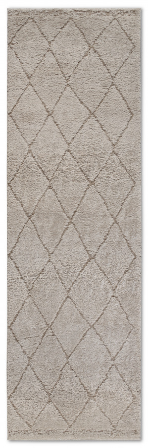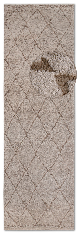 Plastický geometrický motiv kosočtverců ozdobuje tento béžový běhoun, který dodá vašemu interiéru moderní a elegantní vzhled. Díky vysokému shaggy vlasu z polyesteru poskytuje koberec nejen pohodlí, ale také jemnost na dotek. Jeho latexová rubová strana zase zajišťuje stabilitu na jakémkoliv podkladu, což činí tento koberec ideální volbou do každého moderního domova.