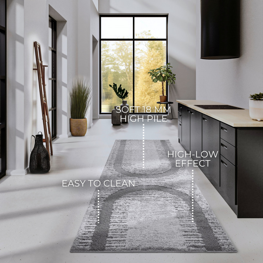 Šedý běhoun s 3D motivem přinese do vašeho interiéru hloubku a dynamiku, kterou nelze přehlédnout. Vysoký shaggy vlas poskytuje neuvěřitelnou jemnost a pohodlí při každém kroku, zatímco latex na rubové straně zajišťuje pevnost a stabilitu. Navíc je běhoun kompatibilní s podlahovým vytápěním, což znamená, že si můžete užívat teplo a komfort i během chladných zimních měsíců.