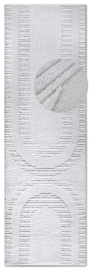 Krémově bílý běhoun s poutavým 3D motivem dodá vašemu interiéru elegantní a moderní vzhled. Vysoký shaggy vlas je nejen extrémně jemný na dotek, ale také skvěle izoluje chlad od podlahy, což přispívá k celkovému komfortu. Pečlivé obšití po celém obvodu zajišťuje dlouhou životnost a stabilitu běhounu.