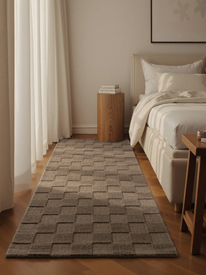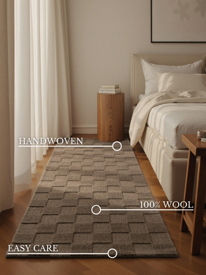 Hnědý běhoun s výrazným čtvercovým vzorem v 3D provedení zaujme svým strukturovaným povrchem, který připomíná šachovnici. Teplý odstín hnědé vnáší do interiéru přirozenou eleganci a harmonii, zatímco ručně tkané zpracování z prvotřídní vlny zaručuje kvalitu i dlouhou životnost. Díky své robustní a přesto jemné textuře působí útulně a zároveň prakticky – tlumí zvuk, přispívá k tepelné pohodě a snadno se udržuje. Skvěle doplní ložnici, obývací pokoj i odpočinkové koutky.