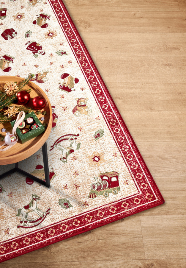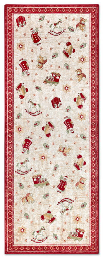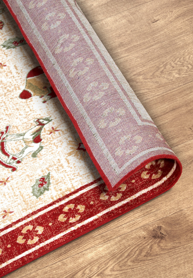 Tento vánoční běhoun přináší do vašeho domova kouzlo Vánoc v každém detailu! Béžové pozadí zdobí jemné motivy připomínající sváteční pohádky a červené lemování dodává slavnostní šmrnc. Je nejen krásný na pohled, ale i praktický – protiskluzová rubová strana zajistí, že bude lépe držet na podkladu. Díky nízkému střiženému vlasu se skvěle hodí do obývacího pokoje i chodby. Připravte se na hřejivou atmosféru Vánoc, která zůstane po celou sezónu!