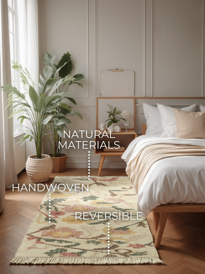 Ručně tkaný běhoun Kelim z kolekce Roya spojuje tradiční řemeslo a přírodní materiály. Díky jutě a bavlně je pevný, lehký, snadno udržovatelný a stylový v každém interiéru.