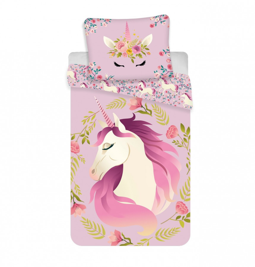 Ložní souprava s originálním motivem v rozměru 140 x 200 cm + 70 x 90 cm je vyrobena z kvalitní 100% bavlny a má zipový uzávěr na polštáři i peřině. Roztomilé povlečení s jednorožcem na květinové louce je oboustranné.