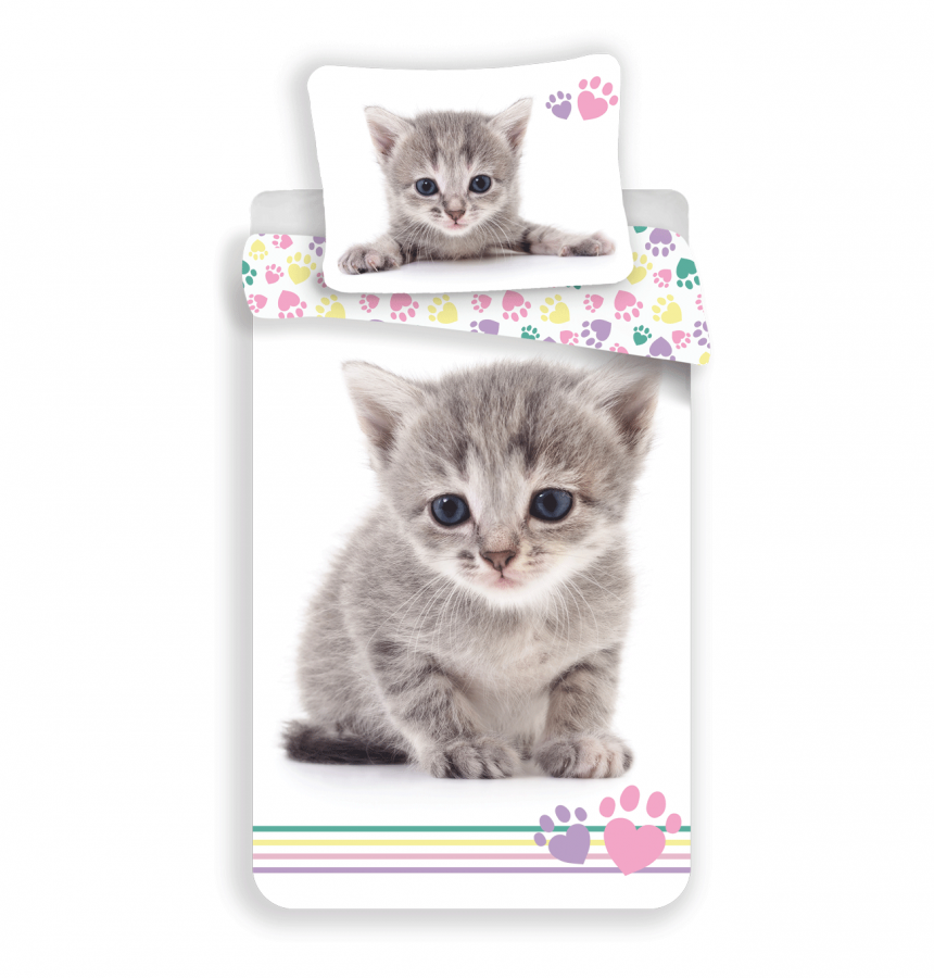 Bavlněné povlečení s nádherným a kvalitním tiskem roztomilého koťátka. Z druhé strany vzor tlapiček.