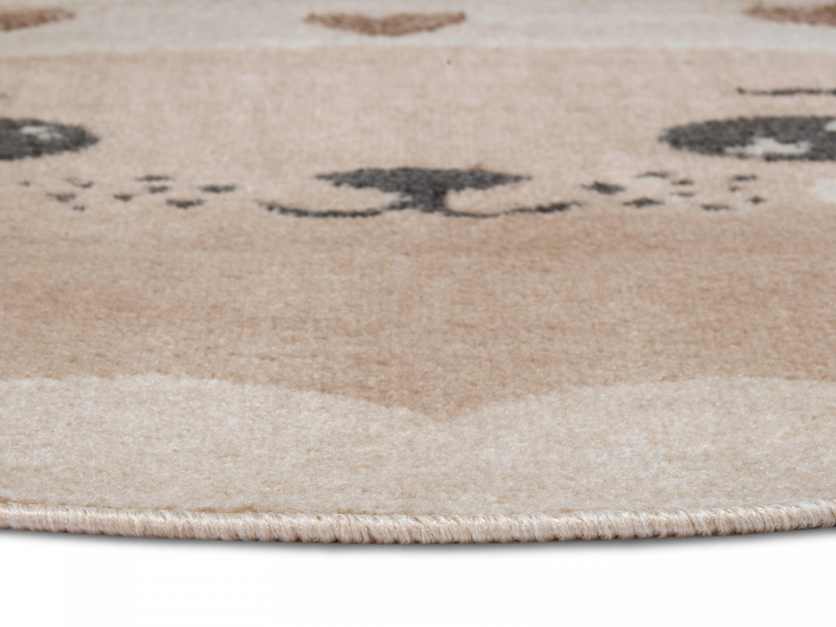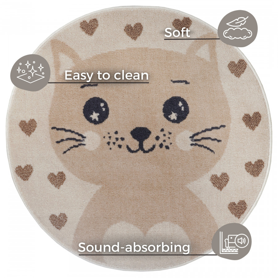 Béžový kruhový koberec s motivem roztomilé kočičky je dokonalým doplňkem do dětského pokoje, který přináší něžnost a hravost. Je vyroben ze 100% polypropylenového vlákna, takže se pyšní měkkým a příjemným povrchem, ideálním pro malé nožky. Střižený vlas střední výšky zajišťuje pohodlí a odolnost při každodenním používání.