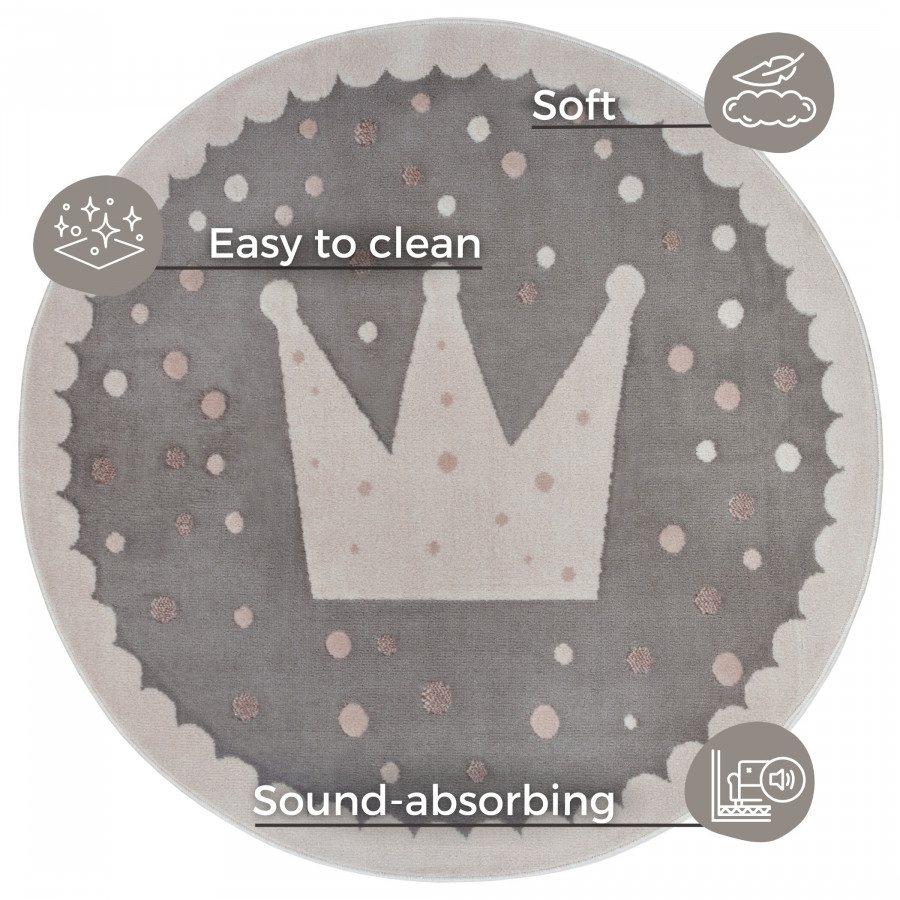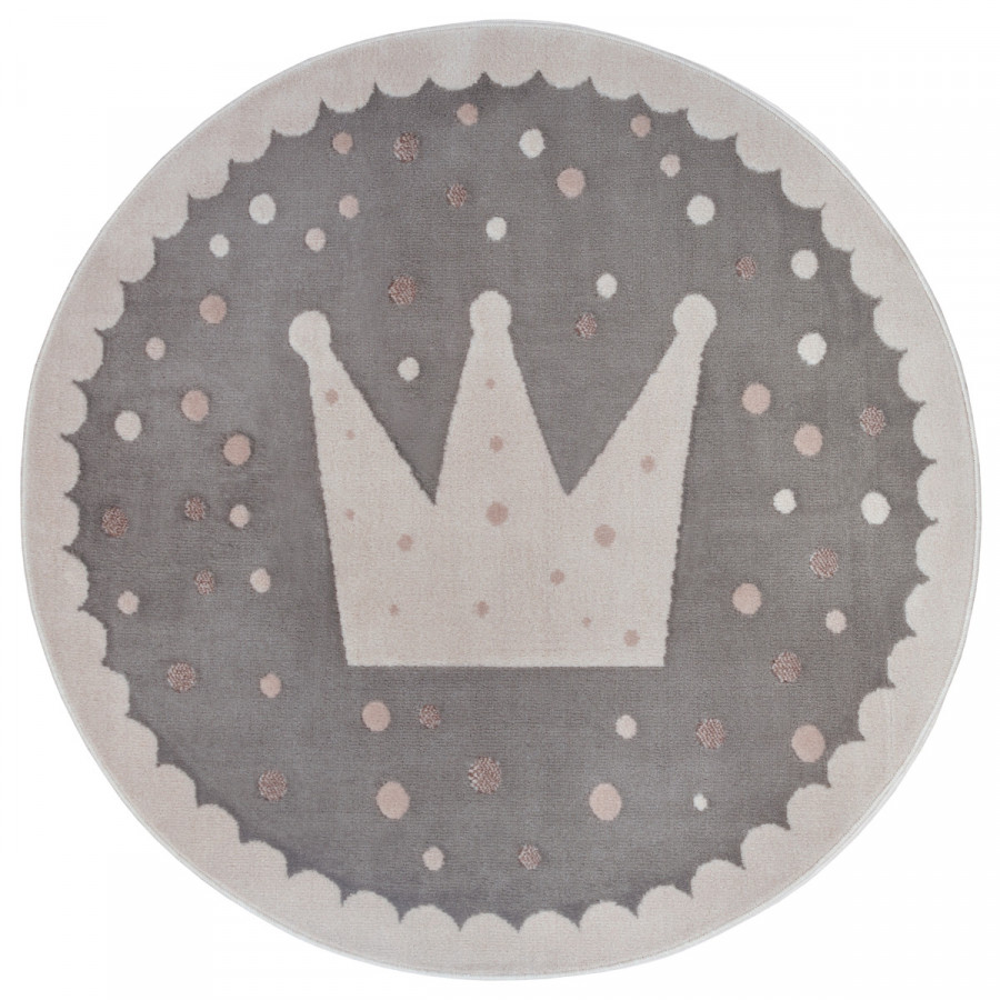 Šedý kruhový koberec s krémově bílou korunkou uprostřed a jemnými růžovými puntíky přinese do dětského pokoje nádech královského stylu. Je vyroben ze 100% polypropylenového vlákna, které zaručuje vysokou odolnost i při častém používání, a jeho středně vysoký střižený vlas je příjemný na dotek. Koberec je navíc obšitý po celém obvodu, což prodlužuje jeho životnost.