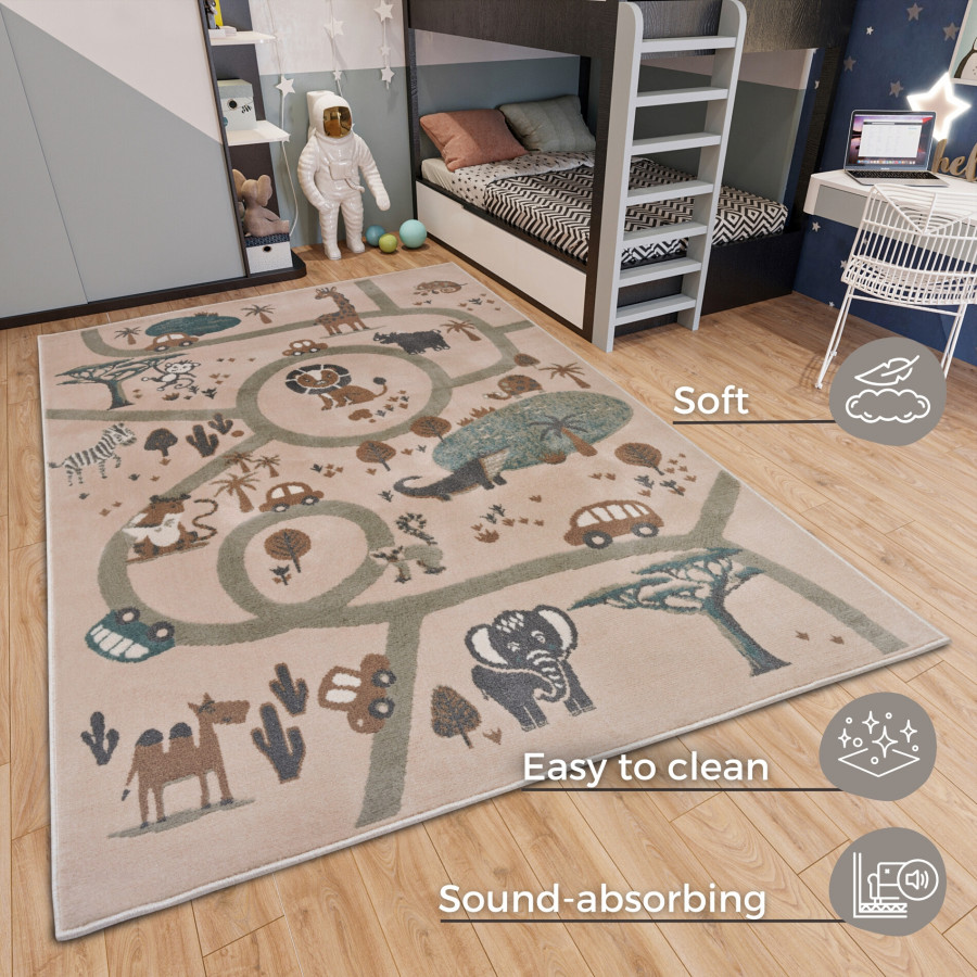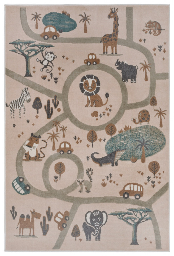 Tento béžový dětský koberec s motivem zvířátek, který připomíná zoologickou zahradu, vnese do každého dětského pokoje hravou atmosféru. Povedené ilustrace zvířat zaručeně potěší malé milovníky přírody. Koberec je vyroben ze 100% polypropylenového vlákna, což zajišťuje jeho odolnost a snadnou údržbu. Díky středně vysokému střiženému vlasu je velmi příjemný na dotek a poskytuje komfort při hraní.
