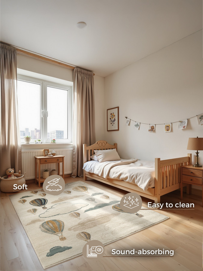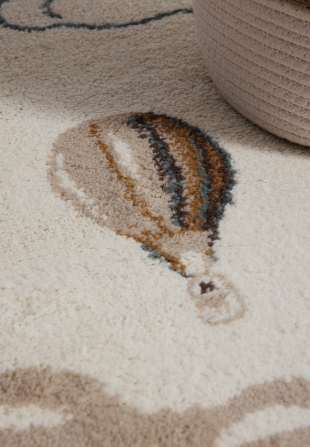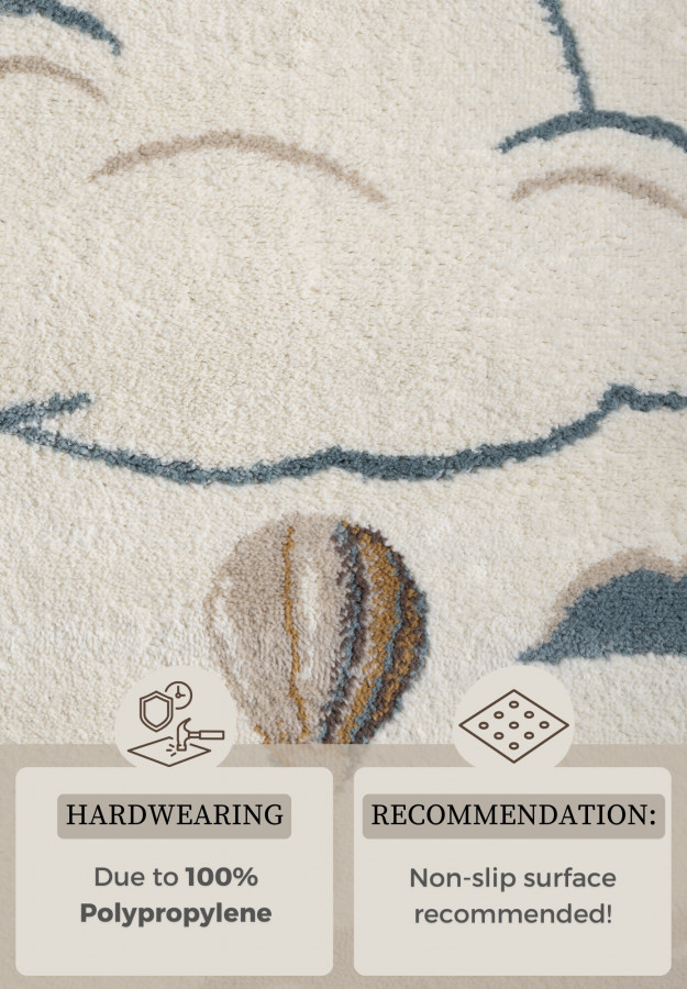 Veselý dětský koberec z polypropylenu přinese radost a hravost do každého pokojíčku! Motiv balónů letících mezi měkkými mraky rozvíjí dětskou fantazii a promění podlahu v kouzelnou krajinu. Koberec má středně vysoký střižený vlas, který je příjemný na dotek a snadno se udržuje. Díky certifikátu OEKO-TEX je zaručeno, že je bezpečný a vhodný i pro děti.