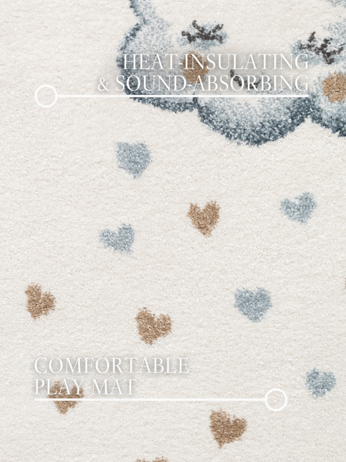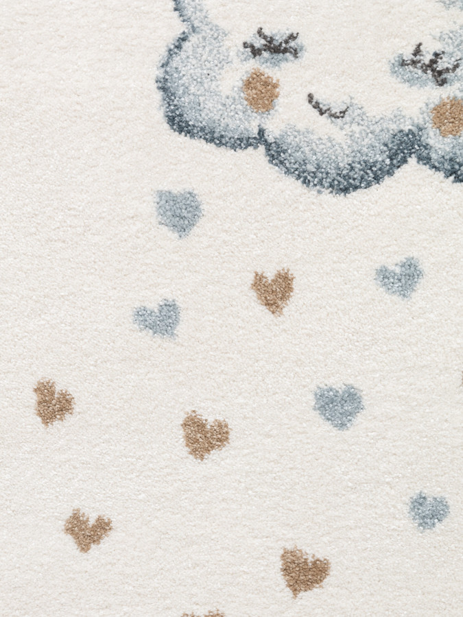 Krémově bílý kruhový koberec rozzáří dětský pokoj veselým motivem slona s parapletem a lenochoda, kteří si společně hrají pod barevnou duhou. Nízký střižený vlas je hebký na dotek a ideální pro hraní i první krůčky. Díky snadné údržbě a jemným barvám se stane oblíbeným místem pro každodenní radost i tiché chvíle pohody.
