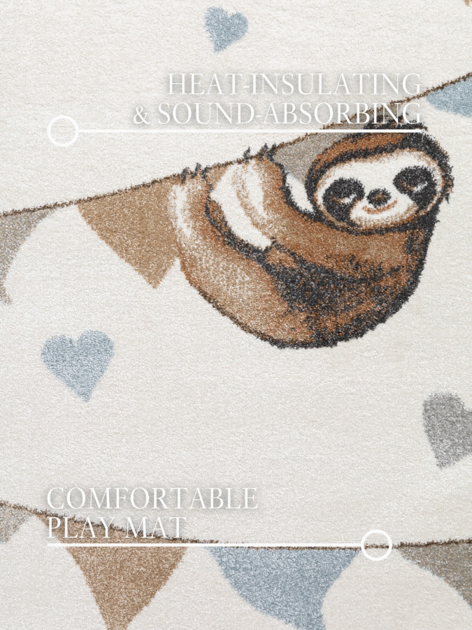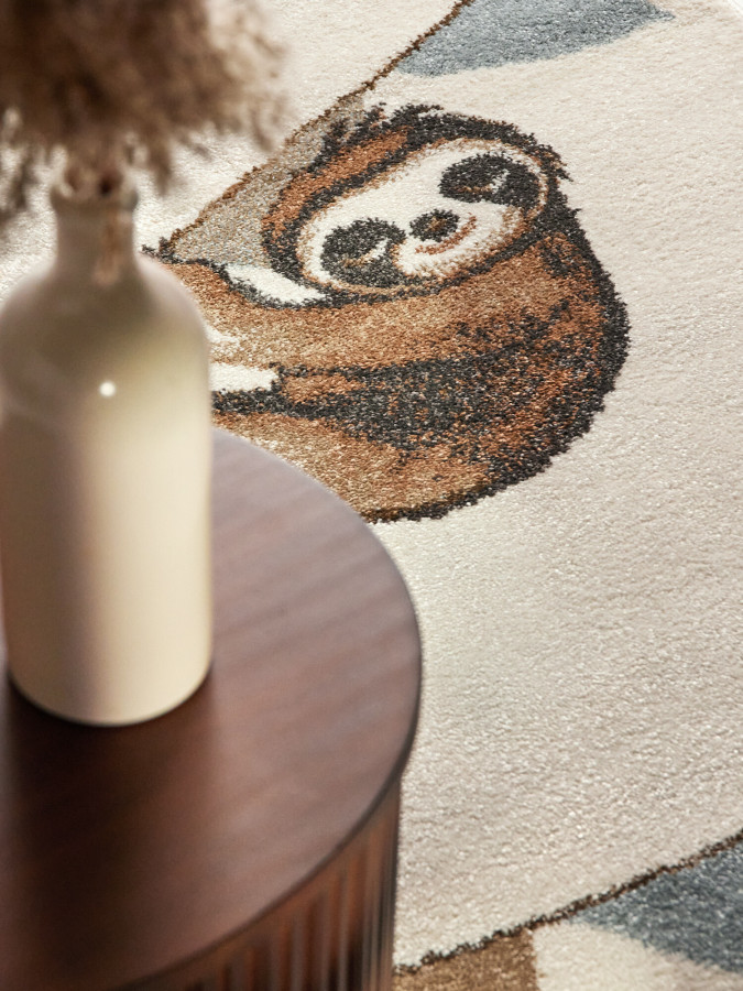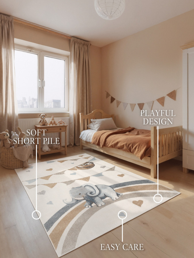 Krémově bílý koberec vypráví veselý příběh o slonovi, který se s lehkostí prochází po duze, zatímco jeho kamarád lenochod sleduje svět s typickým klidem a úsměvem. Jemné pastelové barvy a měkké kontury vytvářejí radostnou a přívětivou atmosféru, která rozvíjí dětskou fantazii. Hebký povrch je ideální pro hraní, lezení i odpočinek, zatímco snadná údržba zaručuje, že si koberec zachová svůj půvab i při každodenním používání.
