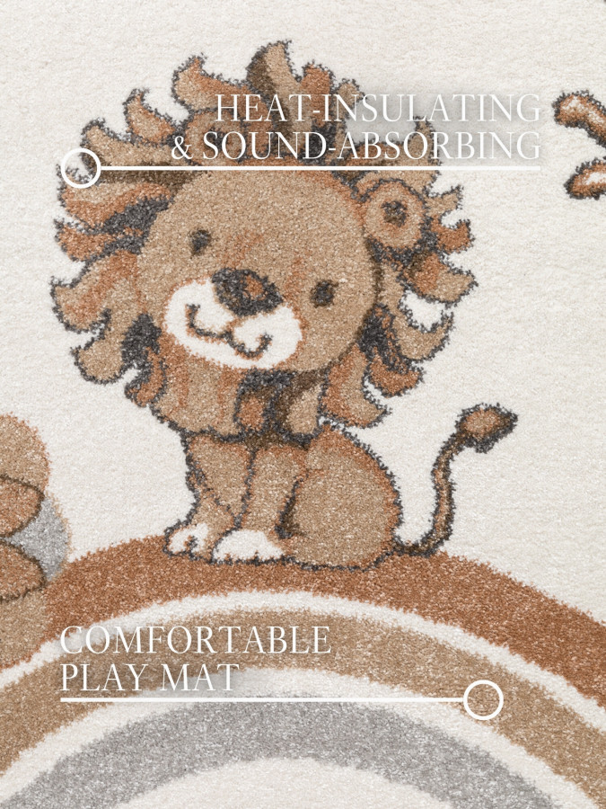 Krémově bílý kruhový koberec přináší do dětského pokoje veselý svět plný fantazie, kde se usměvavý lev pohodlně usadil na duze a jeho kamarádka opice si pohrává s parapletem. Jemné pastelové odstíny vytvářejí radostnou, ale klidnou atmosféru, která vybízí ke snění i hrám. Nízký střižený vlas je příjemný na dotek a ideální pro dětská dobrodružství na zemi. Snadná údržba zaručuje, že kouzlo tohoto hravého motivu zůstane živé každý den.