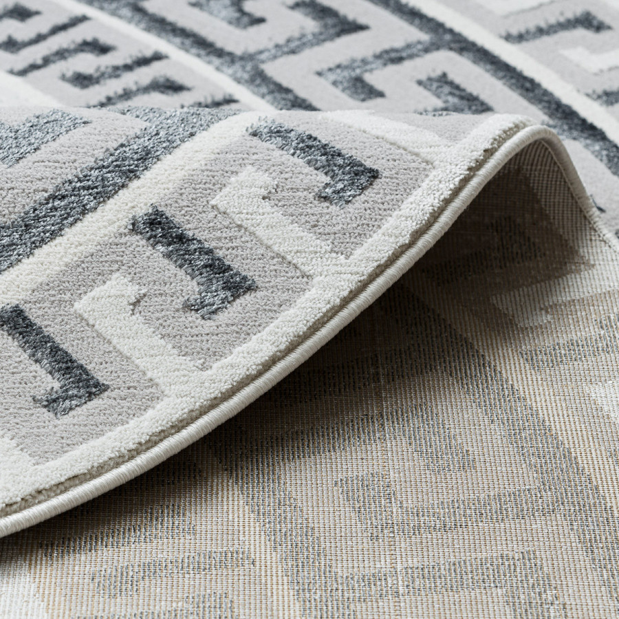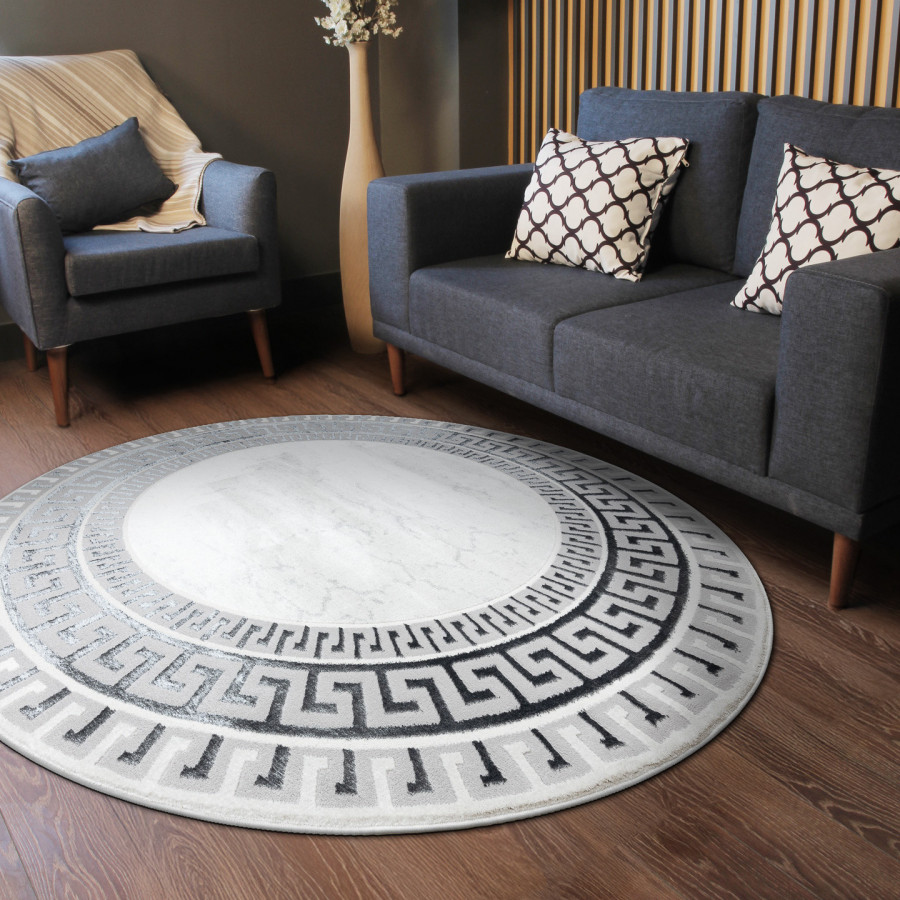 Kruhový koberec Allure 1960 white/grey se skvěle hodí do obývacího pokoje jako reprezentativní prvek, do ložnice pro vytvoření harmonického prostředí i do pracovny, kde podpoří elegantní a seriózní atmosféru. Působí moderně a zároveň nadčasově díky elegantnímu spojení geometrie a jemného mramorového efektu. Světlý podklad s decentní kresbou kontrastuje s výraznou bordurou v šedo-černém provedení, která připomíná klasický motiv řeckého klíče. Koberec je vyrobený ze směsi 60 % polypropylenu a 40 % polyesteru, takže je pevný, odolný a zároveň měkký na dotek. Dvě úrovně vlasu vytvářejí jemný 3D efekt, který podtrhuje strukturu a dodává koberci vizuální hloubku. Certifikace OEKO-TEX garantuje zdravotní nezávadnost, koberec je proto bezpečný i pro domácnosti s dětmi či alergiky. Samozřejmostí je i možnost použití s podlahovým vytápěním.