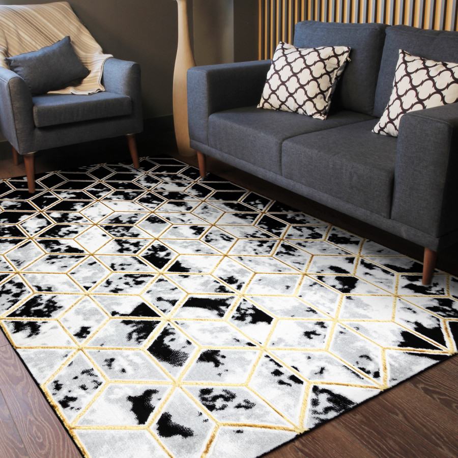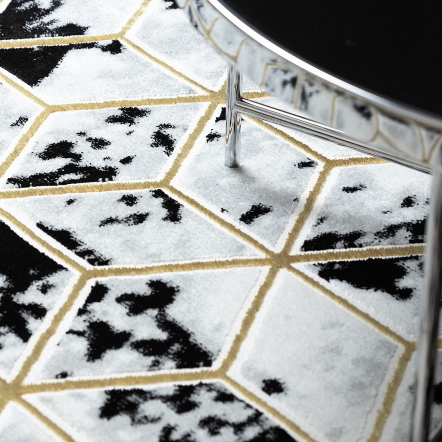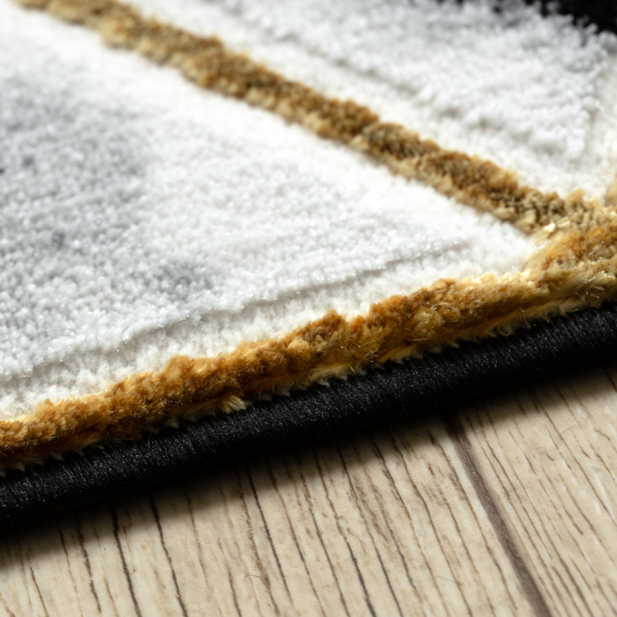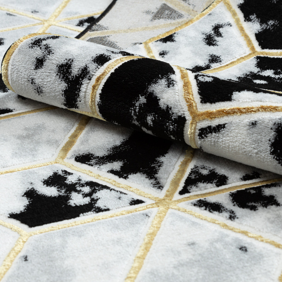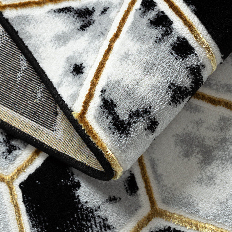 Koberec Allure 1966 black/gold přináší do interiéru odvážný geometrický design s iluzí trojrozměrnosti. Černobílý podklad s mramorovým efektem doplňují jemně zlaté linie, které vytvářejí dojem prostorových kostek. Tento kontrastní a elegantní vzor působí moderně, originálně a okamžitě přitáhne pozornost. Koberec je vyrobený ze směsi 60 % polypropylenu a 40 % polyesteru, což mu dodává vysokou odolnost i příjemnou měkkost. Dvě výšky vlasu vytvářejí jemný 3D efekt, který ještě více podtrhuje geometrický vzor a dodává koberci hloubku. Díky certifikaci OEKO-TEX je zcela bezpečný pro domácnosti s dětmi a alergiky a vhodný i k použití s podlahovým vytápěním.