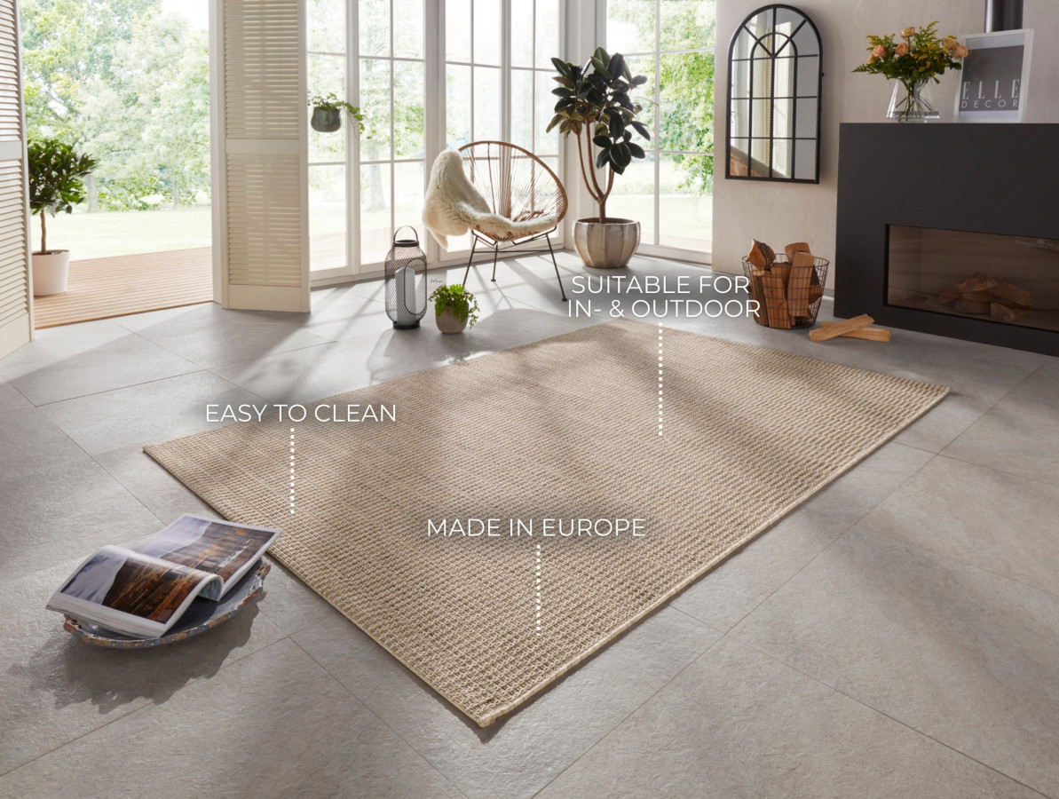 Kusový koberec Brave 103610 z kolekce Elle se řadí mezi cenově dostupné a je obšitý ze všech stran. Koberec je vhodný i na venkovní použití. Je vyroben v přírodní hnědé barvě a navozuje pocit ručně tkaného koberce. Patří do tzv. "Boucle" koberců - nemá vlas.