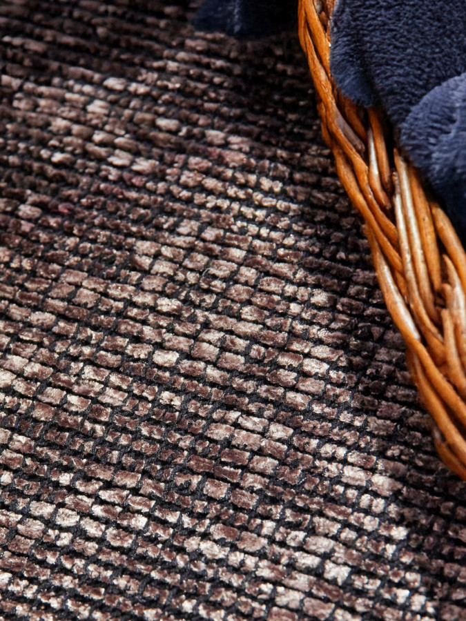 Hnědý koberec vnáší do interiéru hřejivou atmosféru a jemný nádech elegance. Jeho povrch s nízkým střiženým vlasem působí hladce a vytváří zajímavý efekt drobných „dlaždiček“, který ožívá při každém dopadu světla. Kratší strany zdobí hravé třásně dodávající koberci lehkost a šmrnc, zatímco delší jsou pečlivě obšité pro čistý a upravený vzhled. Odolný a snadno udržovatelný materiál zaručuje, že si koberec svůj kouzelný charakter udrží i v rušných domácnostech.