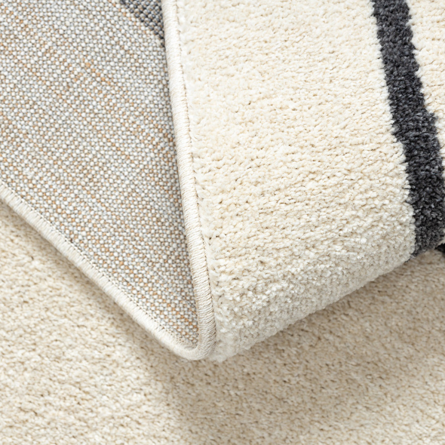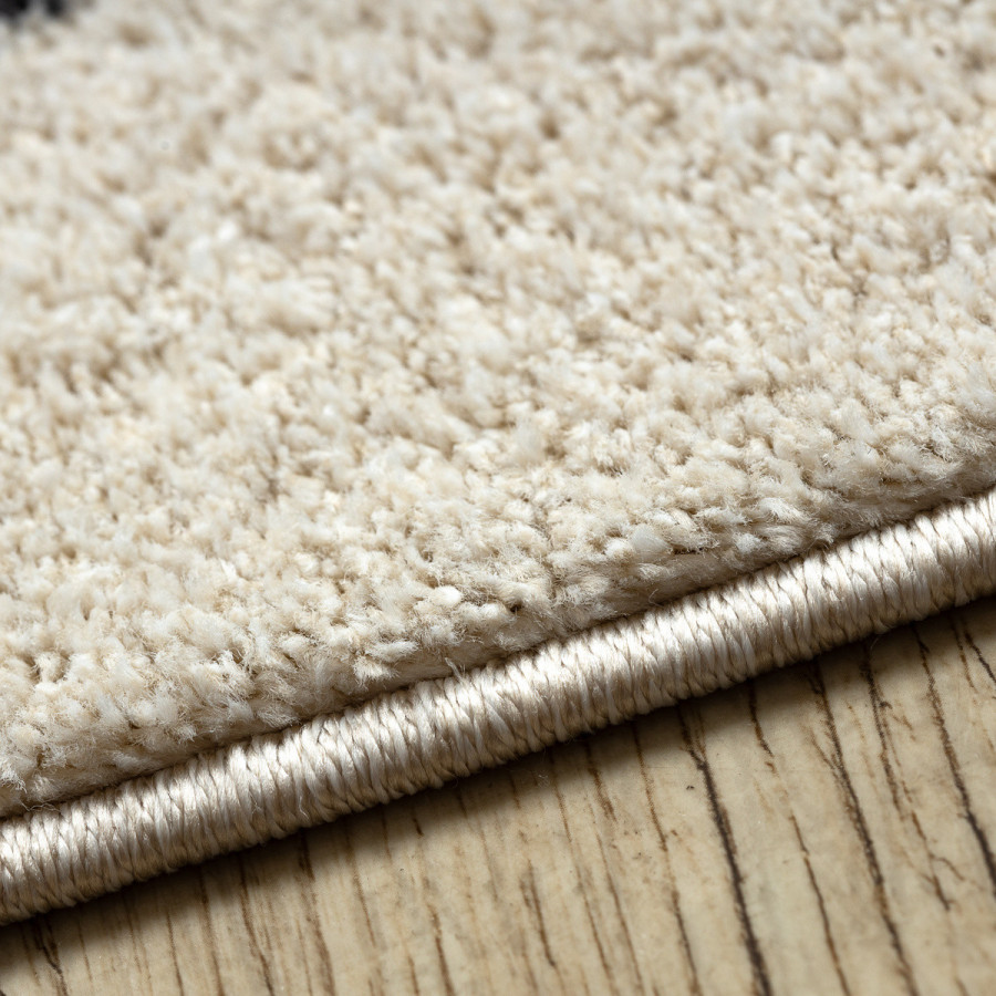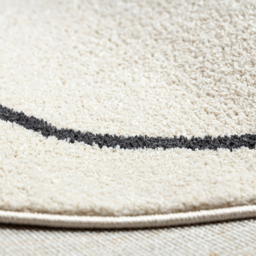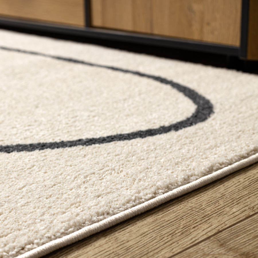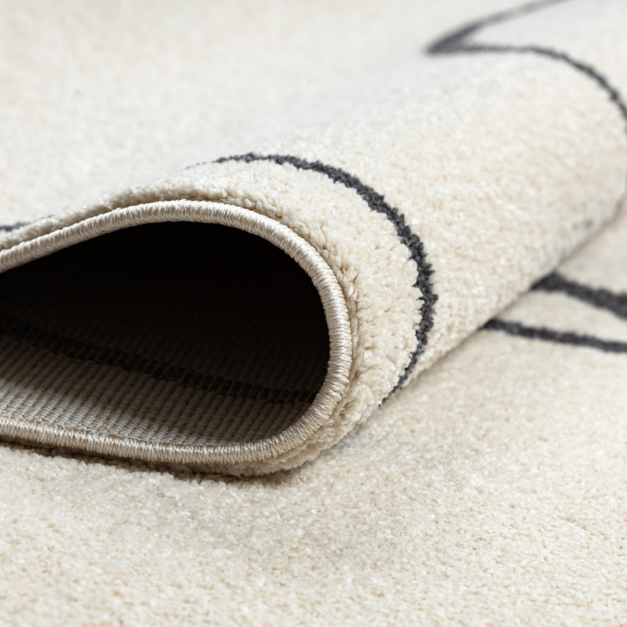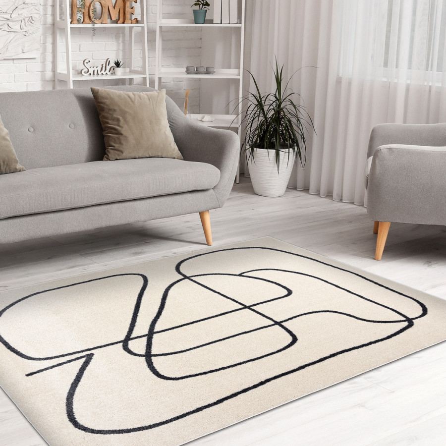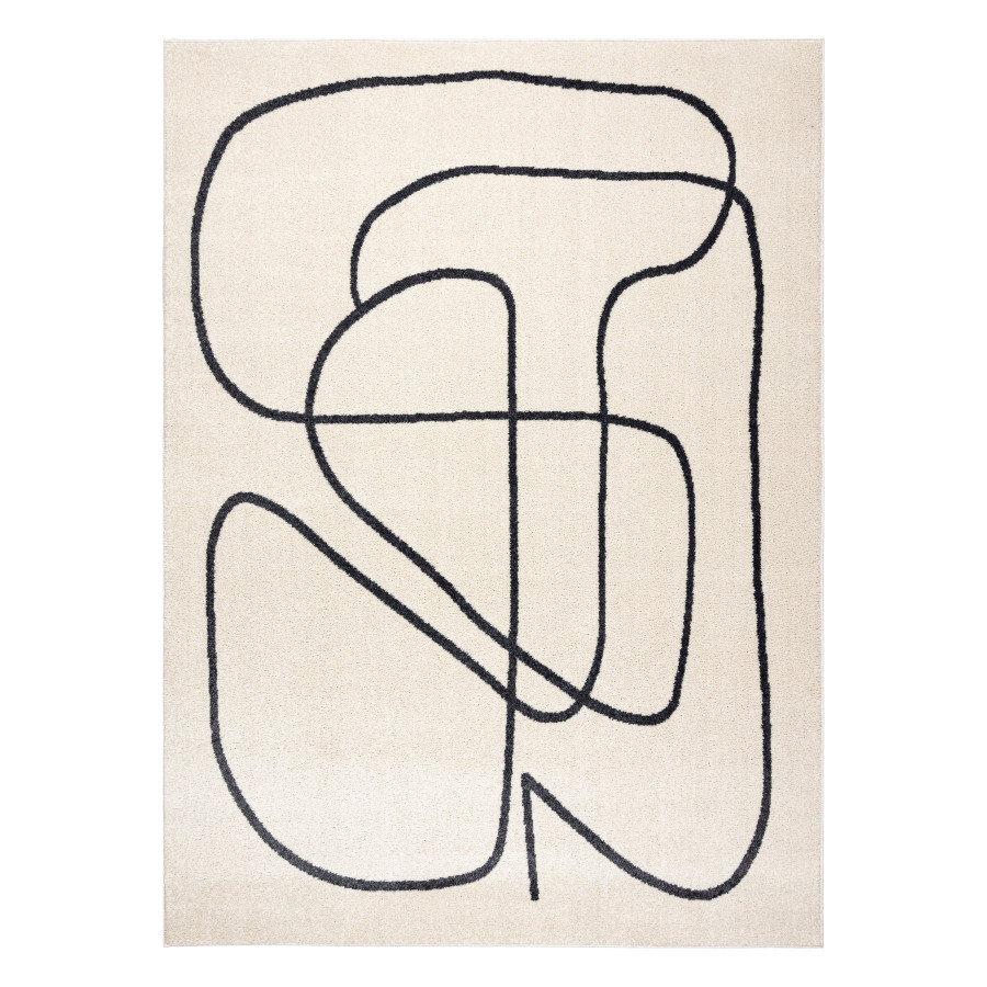 Koberec na první pohled zaujme svou jednoduchou, a přesto výraznou estetikou. Krémově světlý podklad působí čistě a jemně, zatímco černá abstraktní linie, která se volně klikatí po celé ploše, dodává koberci moderní a umělecký charakter. Díky střiženému polypropylenovému vlasu je povrch hebký a příjemný na dotek, zároveň snadno udržovatelný a odolný vůči běžnému opotřebení. Koberec je pečlivě obšitý po celém obvodu, takže si dlouhodobě zachovává svůj elegantní vzhled. Hodí se zejména do moderně laděných interiérů, kde dokáže vytvořit originální atmosféru a stát se nepřehlédnutelným designovým prvkem.