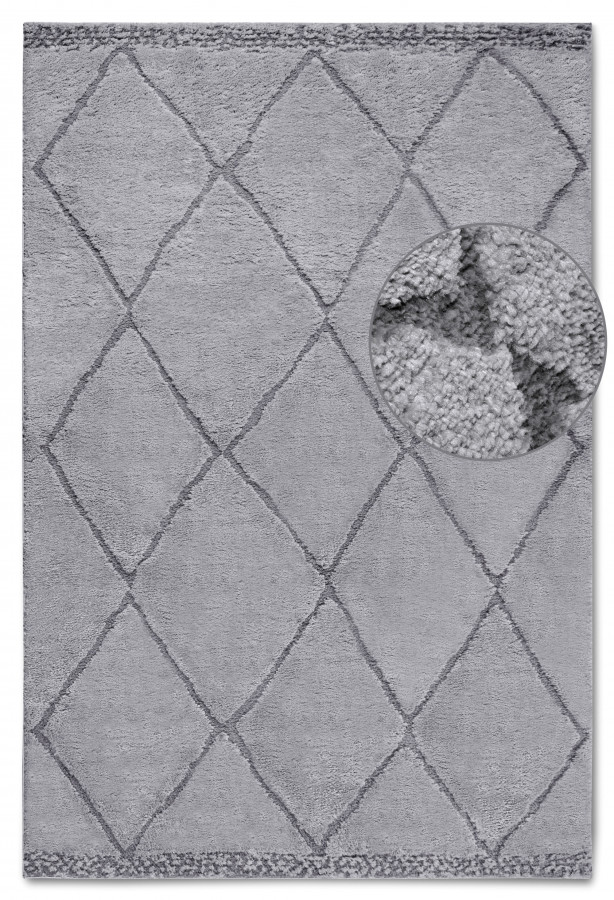 Šedý koberec s geometrickým motivem kosočtverců přinese do vašeho domova sofistikovanou eleganci a moderní styl. Vysoký shaggy vlas zajišťuje neuvěřitelnou jemnost a pohodlí, zatímco latexová rubová strana poskytuje pevnost a stabilitu. Díky kompatibilitě s podlahovým vytápěním si můžete užívat teplo a komfort i v chladných měsících.
