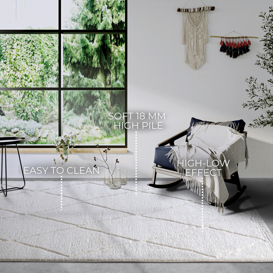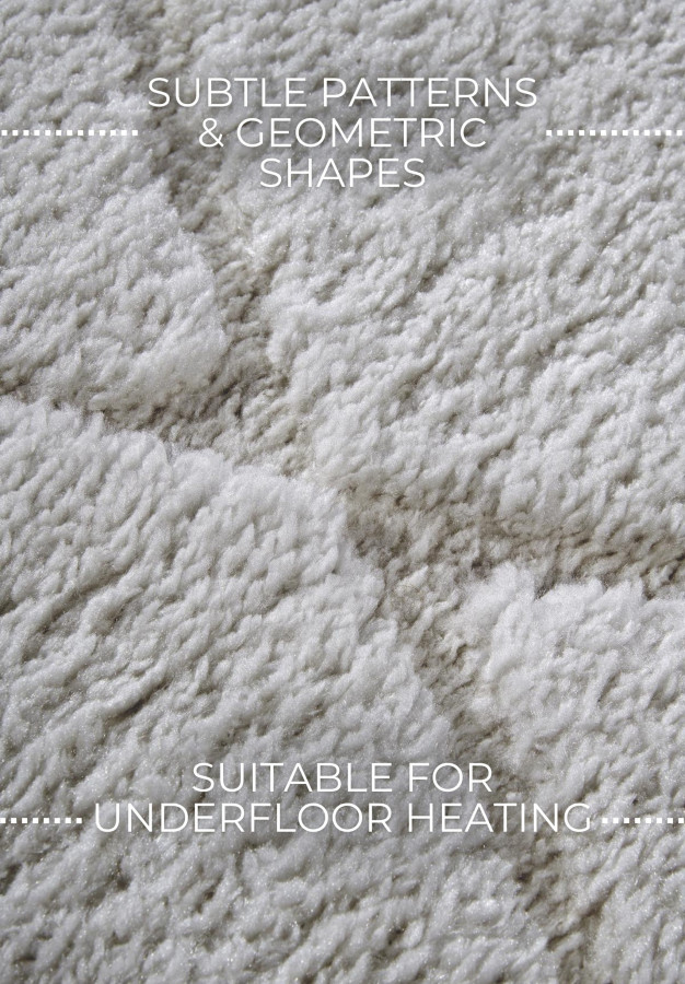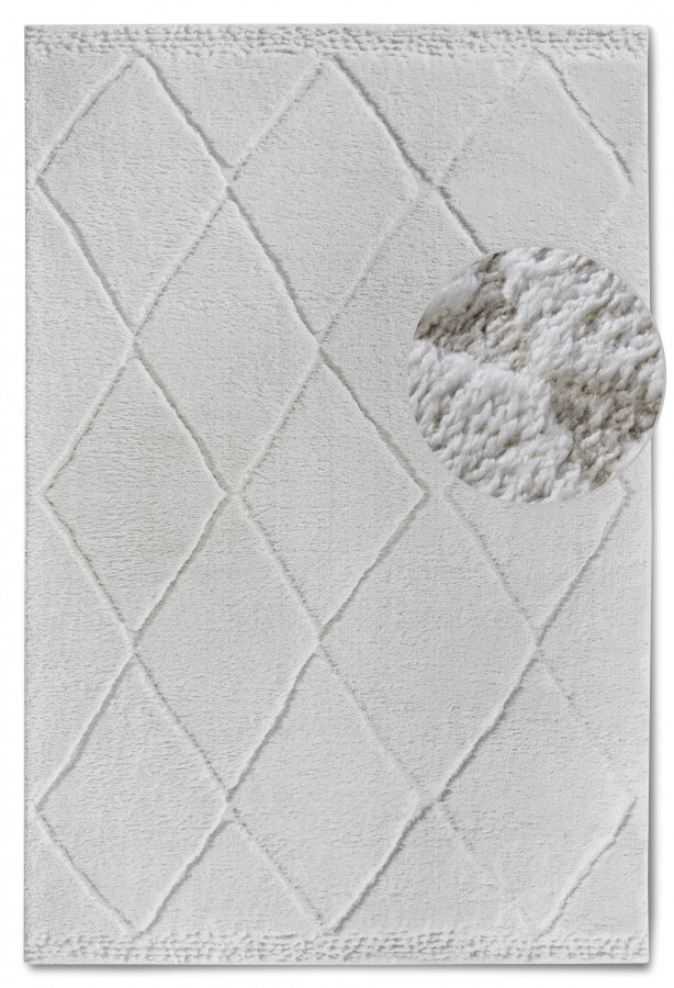 Vneste do svého interiéru svěžest a eleganci s krémově bílým kobercem zdobeným geometrickými kosočtverci. Jeho vysoký shaggy vlas zajišťuje neuvěřitelnou jemnost a pohodlí při každém kroku, zatímco rubová strana z latexu garantuje pevnost a stabilitu. Navíc je kompatibilní s podlahovým vytápěním, takže si můžete užívat teplo a komfort i v zimních měsících.