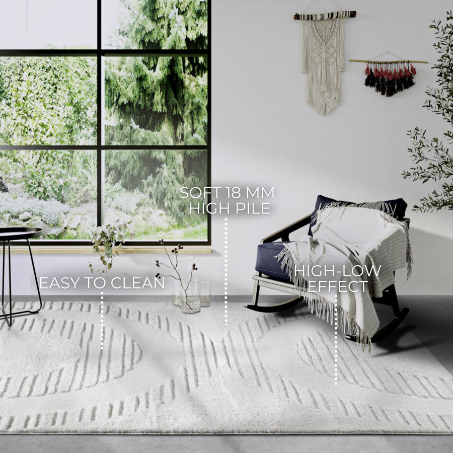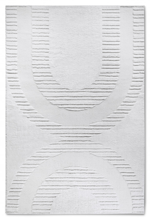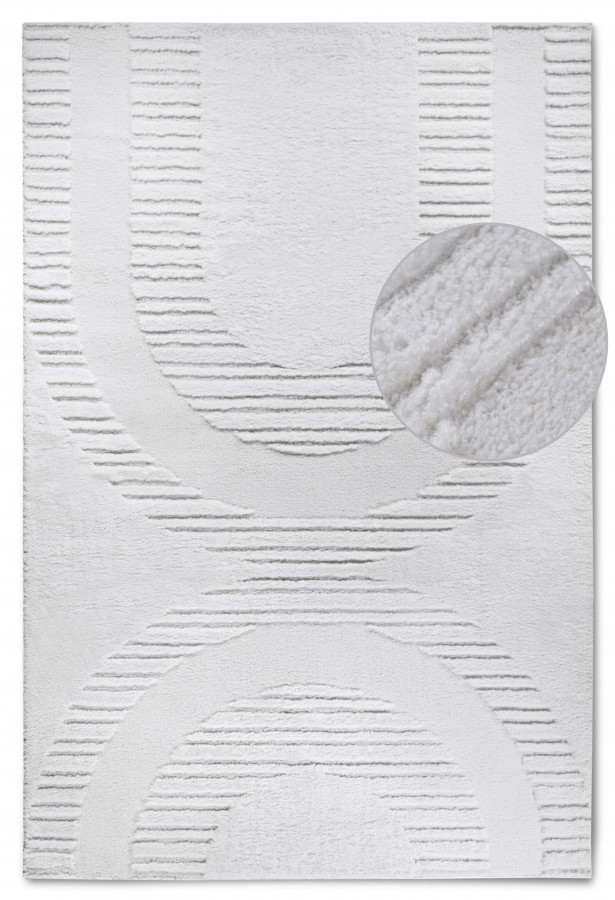 Krémově bílý koberec s poutavým 3D motivem dodá vašemu interiéru elegantní a moderní vzhled. Vysoký shaggy vlas je nejen extrémně jemný na dotek, ale také skvěle izoluje chlad od podlahy, což přispívá k celkovému komfortu. Pečlivé obšití po celém obvodu zajišťuje dlouhou životnost a stabilitu koberce.