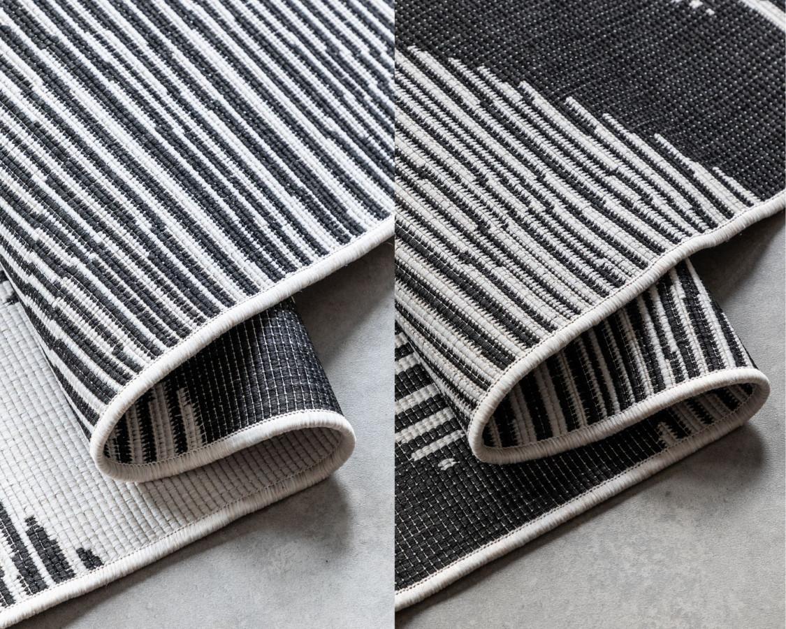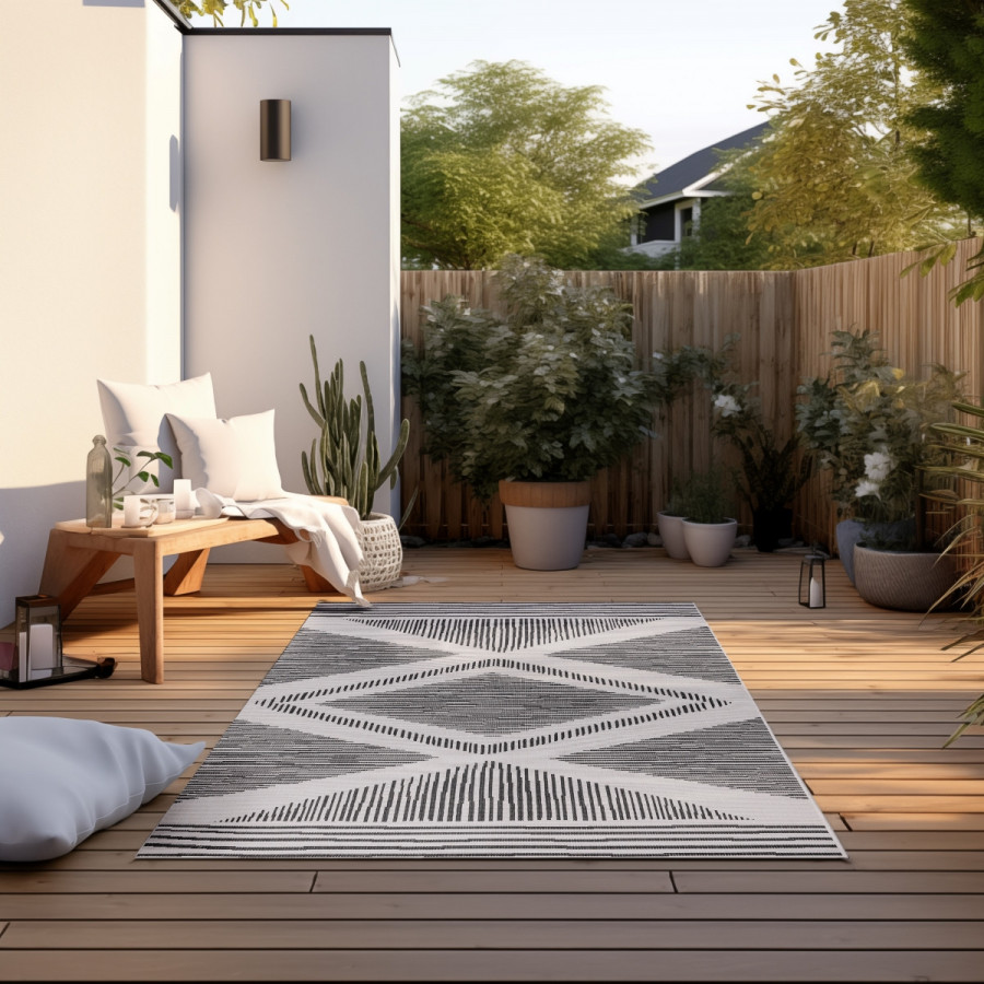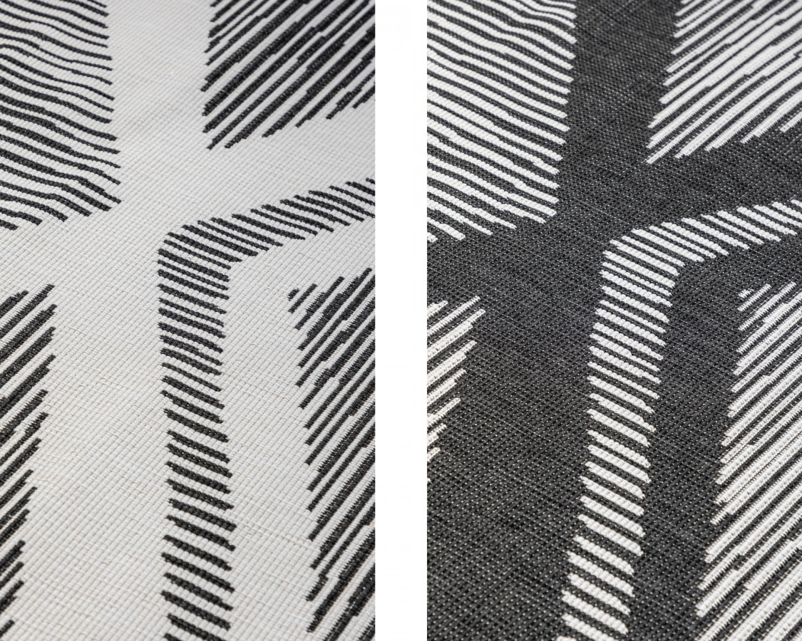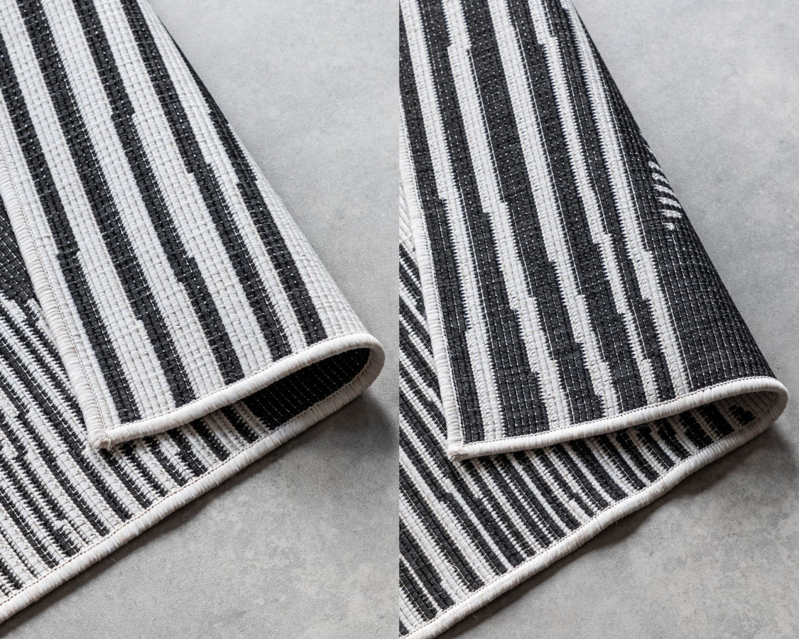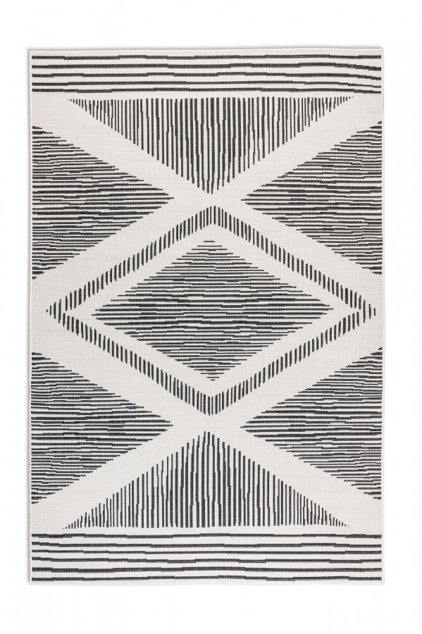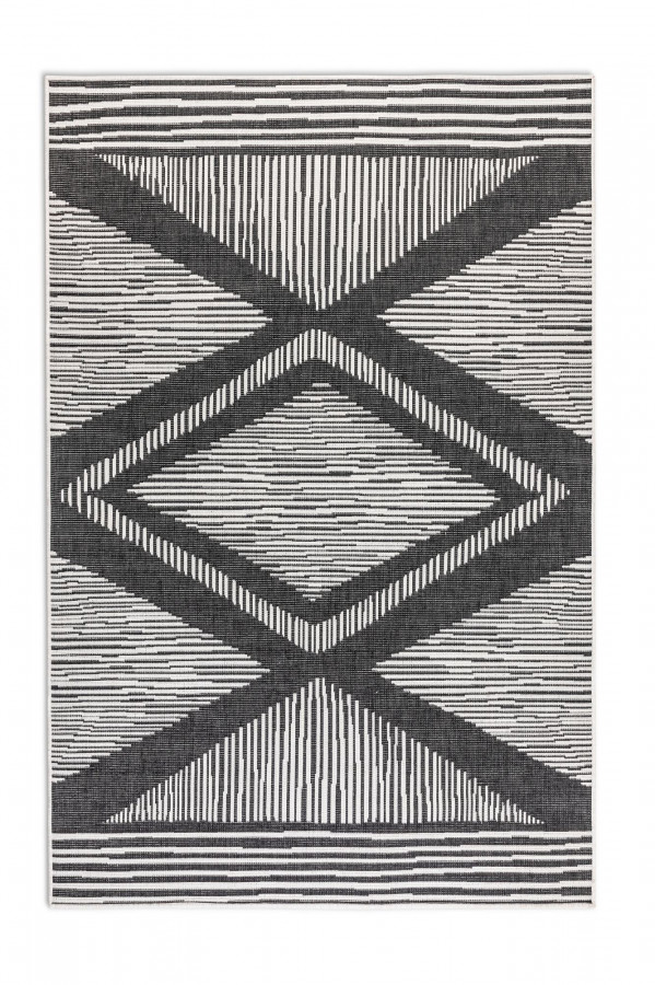 Kosočtverce a jemné proužky zdobí tento černo-bílý koberec, který udělá parádu doma i v exteriéru. Díky velmi krátkým smyčkám z polypropylenu je totiž odolný, pevný a snadný na údržbu. Nevadí mu ani vyšší zátěž, ani povětrnostní vlivy. Dále je obšitý po celém obvodu a má certifikát zdravotní nezávadnosti.