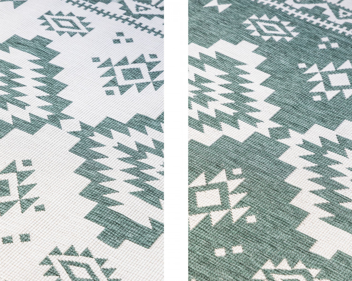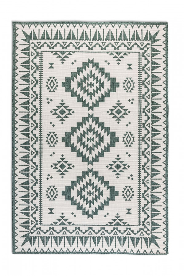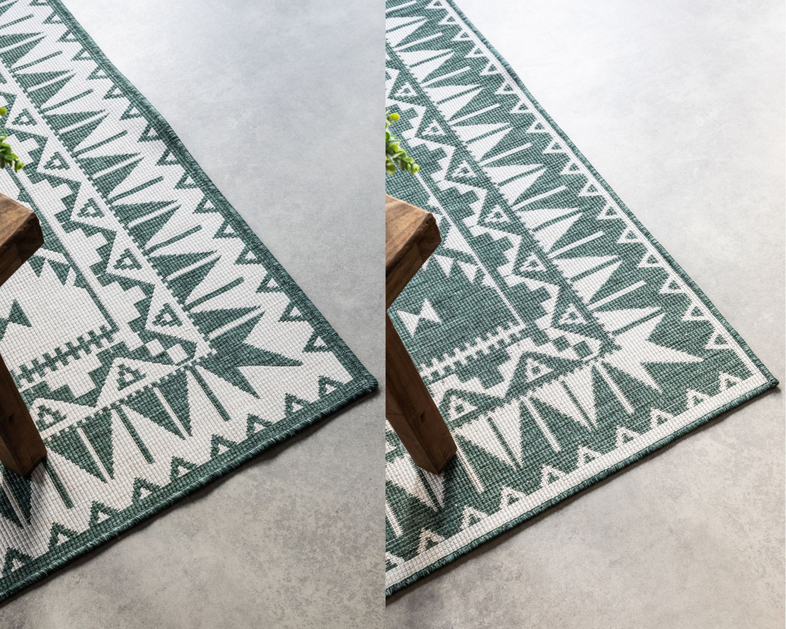 Zeleno-bílý oboustranný koberec, který můžete otáčet dle libosti. Z každé strany vypadá trochu jinak díky inverznímu barevnému provedení. Vyrábí se z polypropylenu a namísto klasického vlasu má velmi krátké smyčky, které jsou odolné, pevné a snadné na údržbu. Koberec tak poslouží nejen doma, ale i v exteriéru.