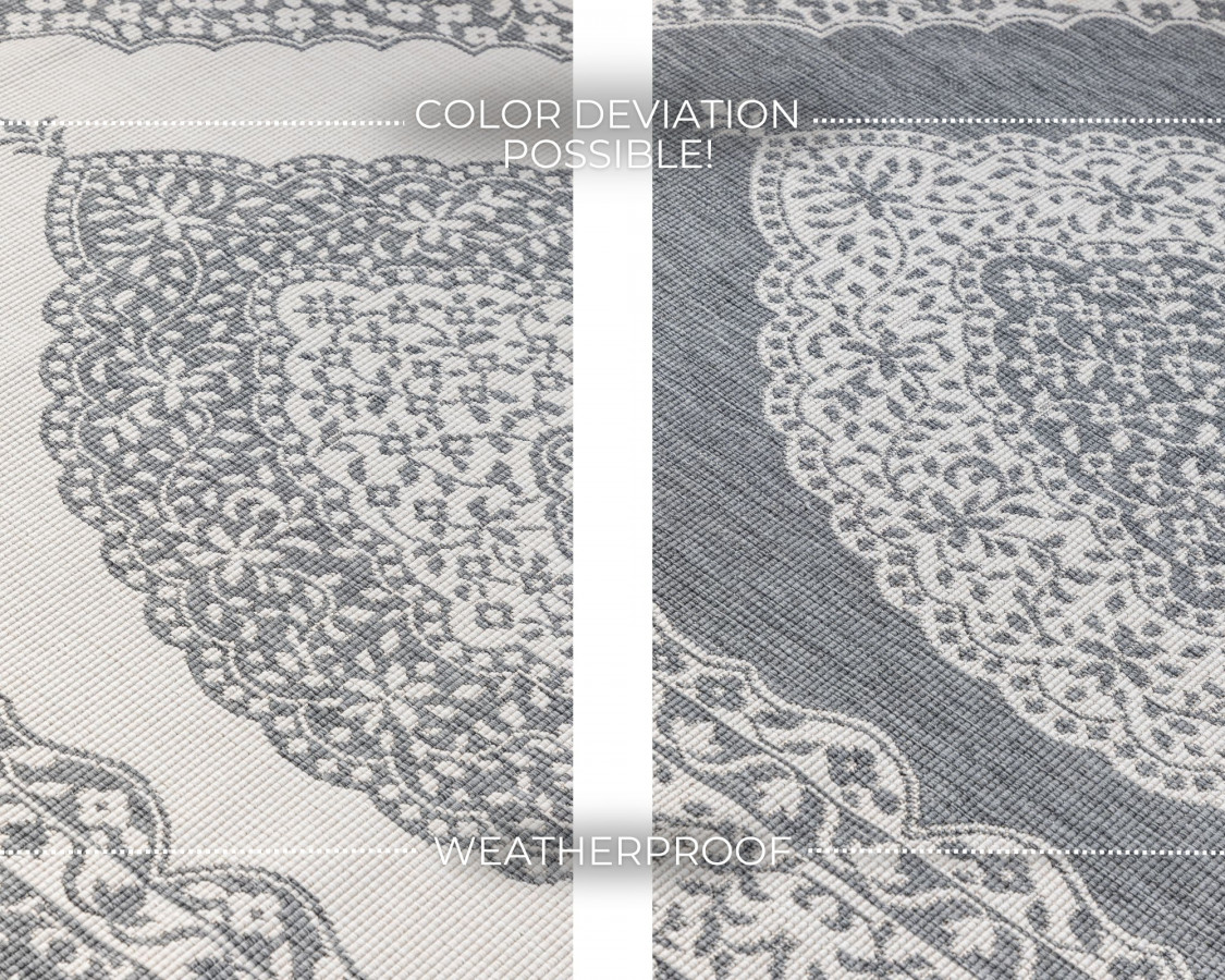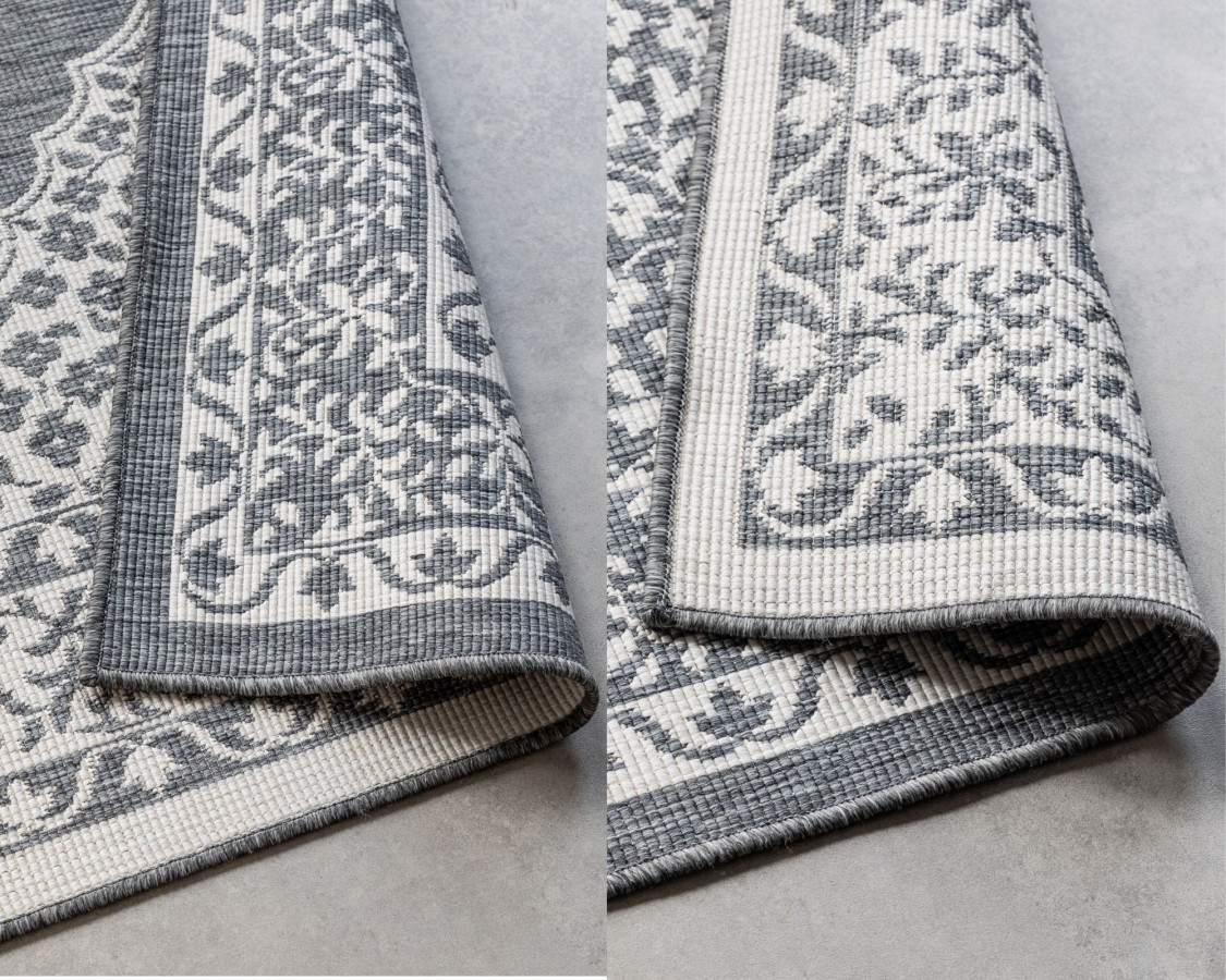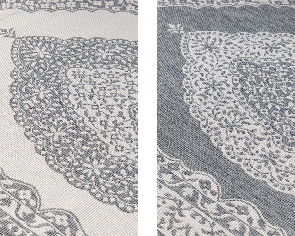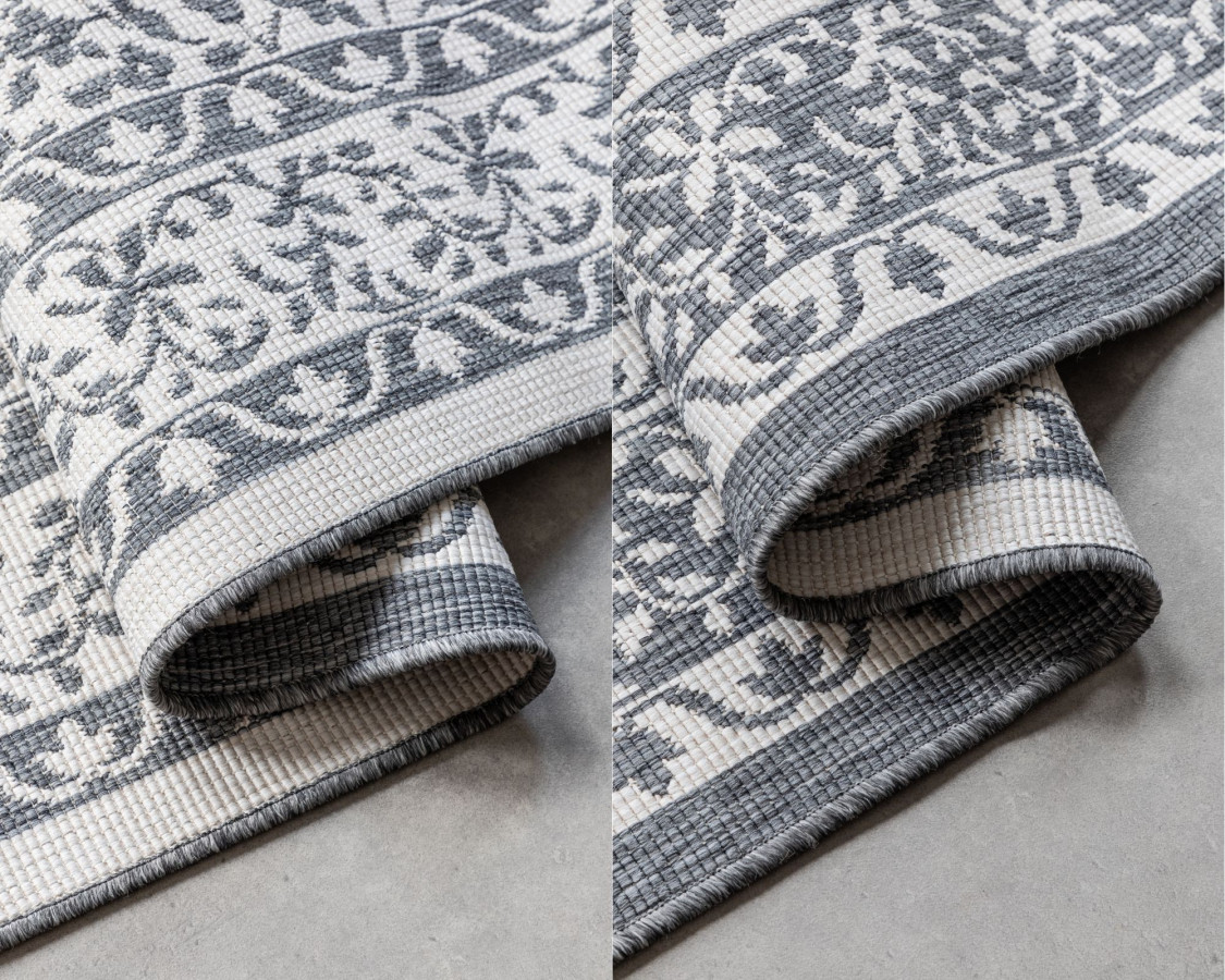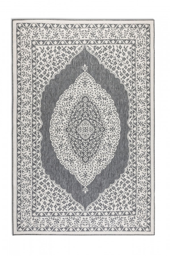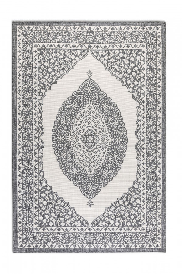 Šedo-bílý koberec s velmi propracovaným středovým medailonem. Květinové motivy zdobící celý kousek budou slušet obývacímu pokoji, chodbě i terase. Tento fešák si totiž poradí i vyšší zátěží a nevadí mu ani povětrnostní vlivy. Tomu napomáhají velmi krátké smyčky namísto klasického vlasu. Výhodou je pak i snadná údržba nebo to, že je koberec oboustranný.