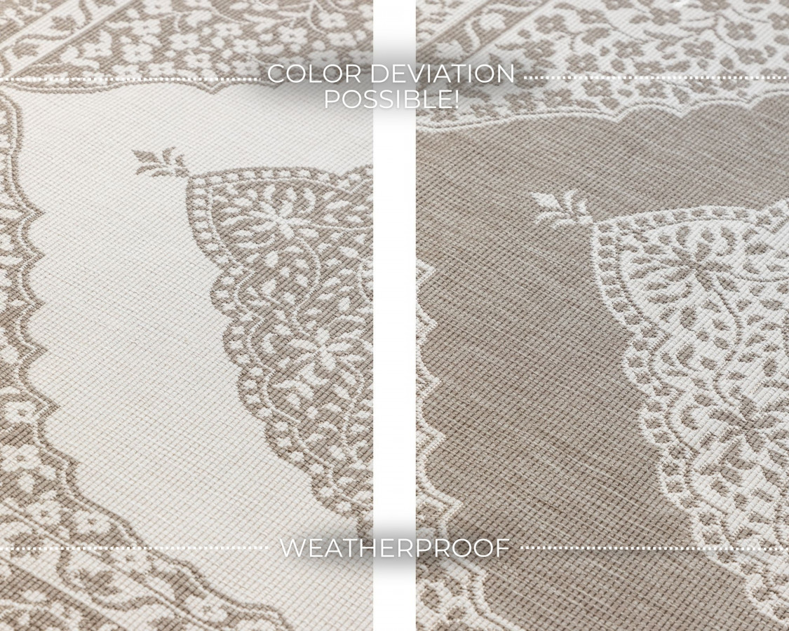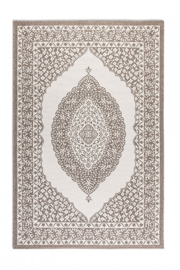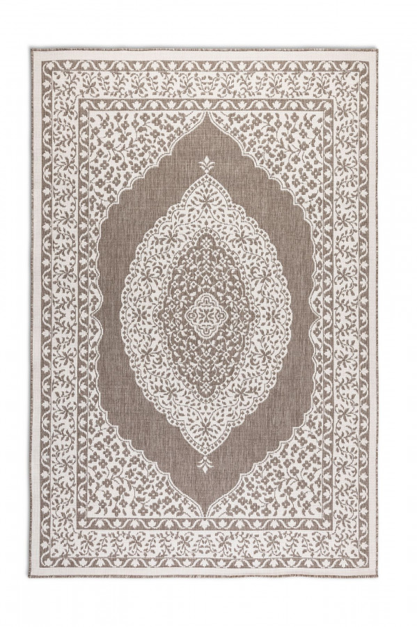 Béžový koberec s propracovaným květinovým motivem má neutrální barvu, ale rozhodně se nedá říct, že by byl nenápadný. Navíc je oboustranný, takže ho můžete otáčet a užívat si tak obě barevně inverzní strany. Koberec má namísto klasického vlasu velmi krátké smyčky, a proto se vyznačuje pevností, snadnou údržbou a odolností, a to i vůči povětrnostním vlivům, takže ho můžete položit i do exteriéru.