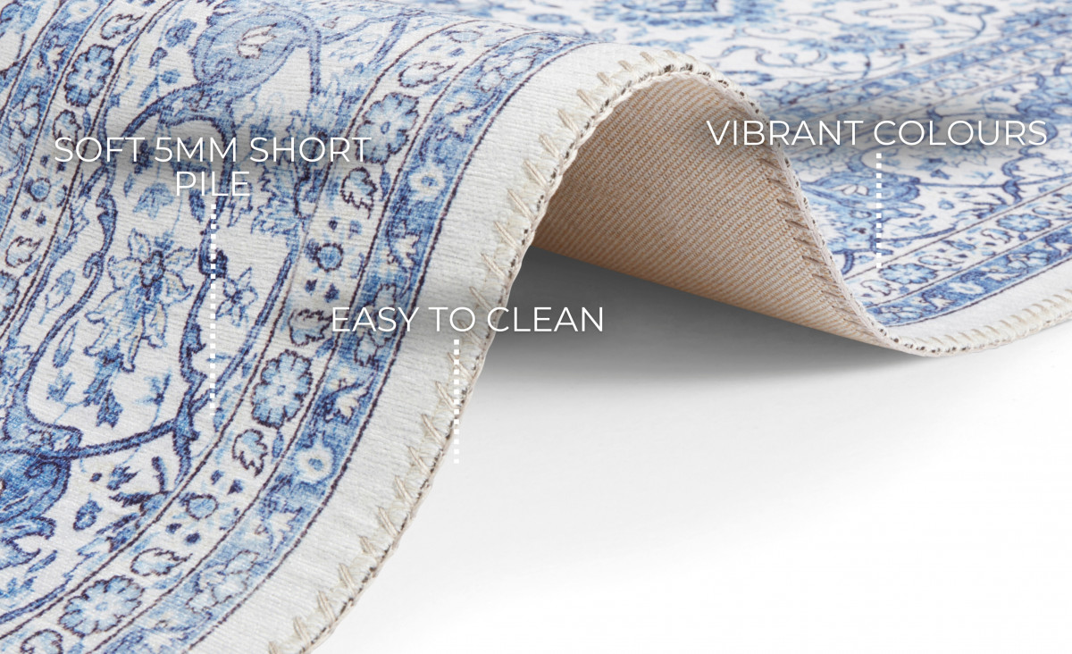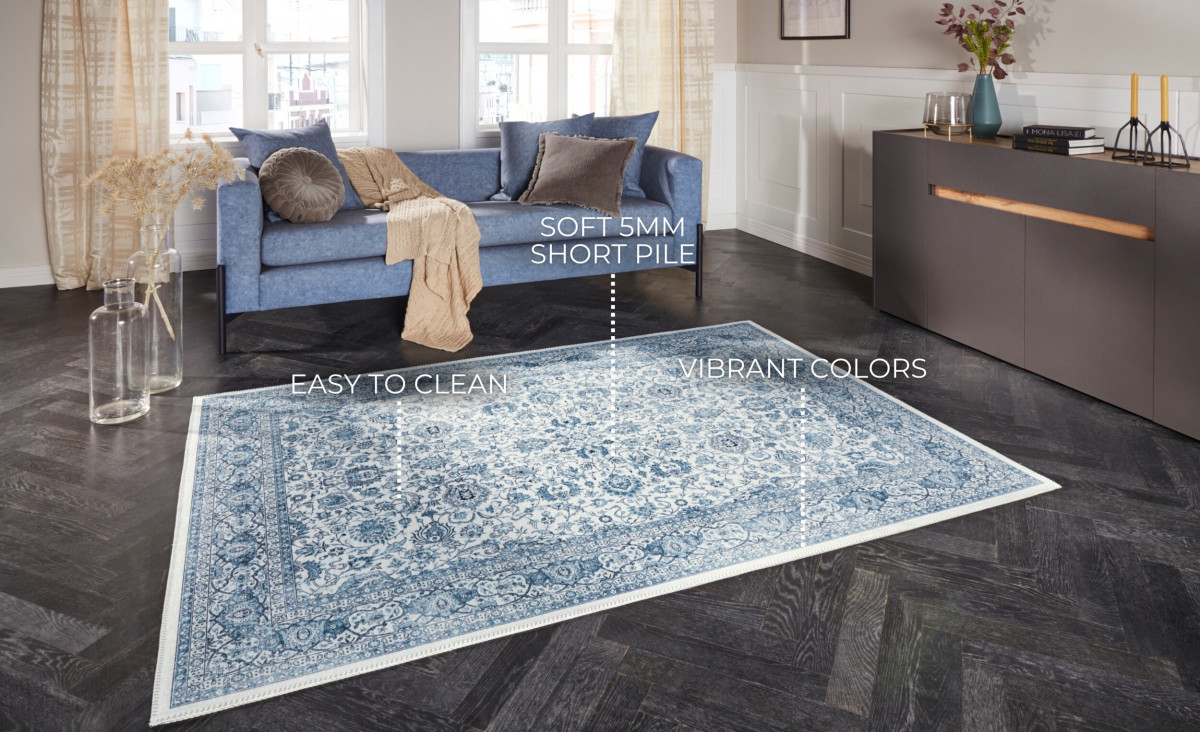 Do modra laděný kusový koberec Imagination 104219 z kolekce Elle Decoration se vyrábí z měkkého polyesterového vlákna. Tento orientální koberec vyniká nejen atraktivním vzorem, ale také praktickými vlastnostmi, mezi které patří bezvlasý pro snadnou údržbu, obšití na všech stranách, či možnost pokládky na vytápěné podlahy. Hodí se např. do obývacích pokojů, ale využitelný je i v jiných interiérech.
