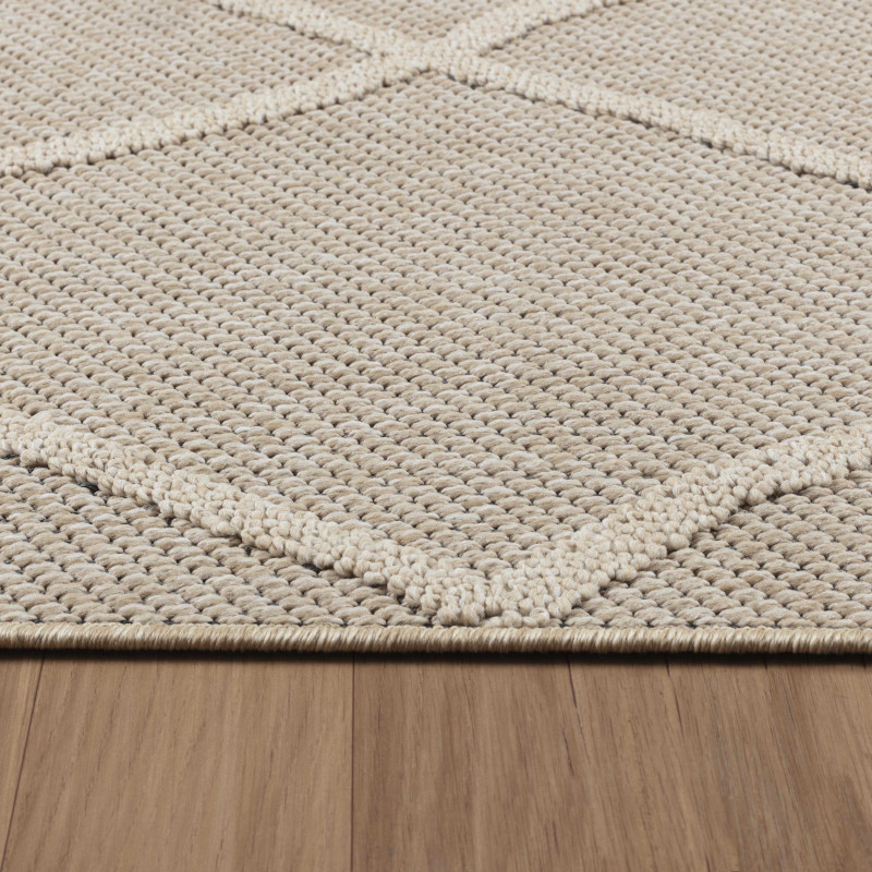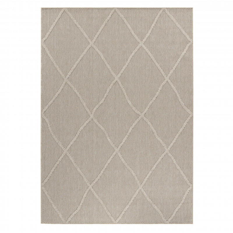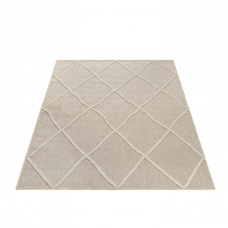 Béžový koberec, který kombinuje velmi krátké smyčky s vyšším vlasem, což vytváří zajímavý 3D efekt. Nepravidelné vystupující kosočtverce dodají šmrnc každé domácnosti, přičemž koberec můžete položit do chodby, obýváku, ale také ven na terasu nebo balkon.