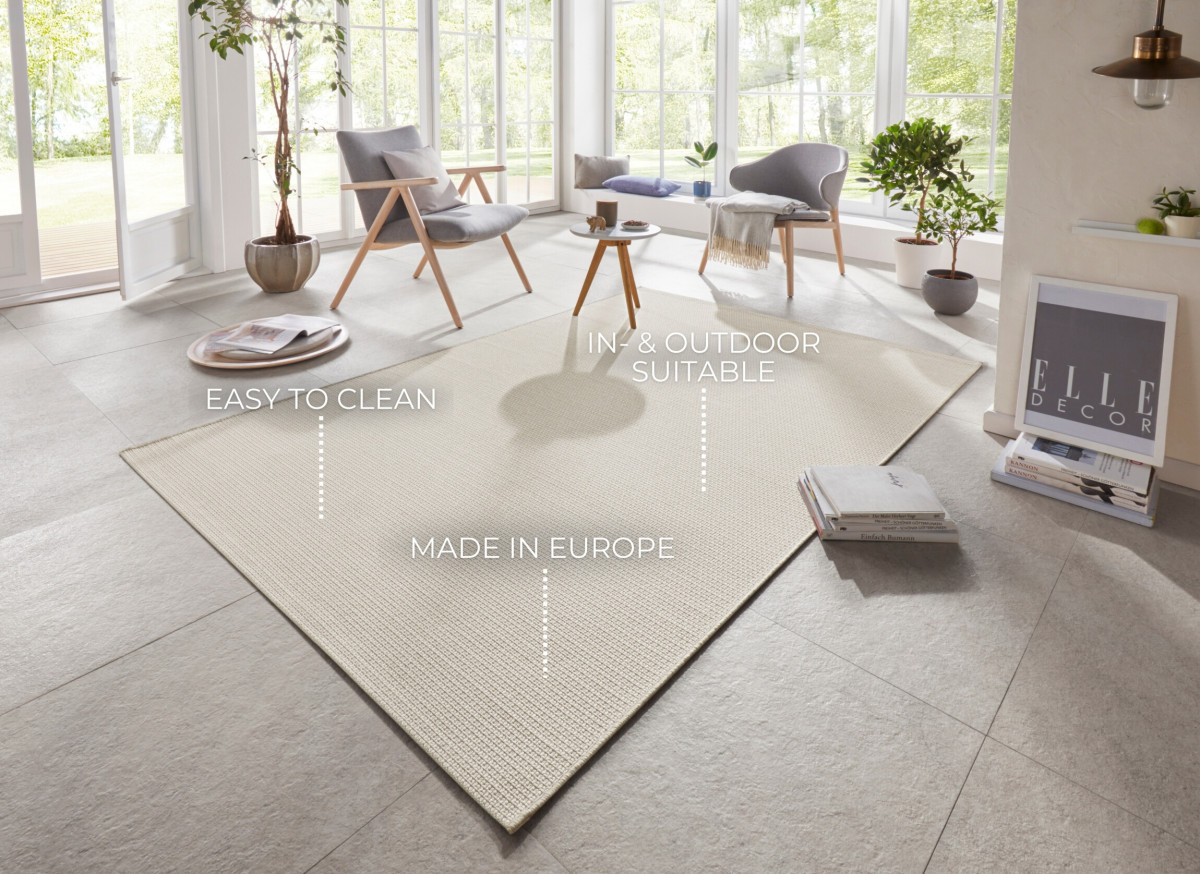 Kusový koberec Secret 103559 z kolekce Elle patří mezi cenově dostupné koberce, které mají i venkovní využití. Pro výrobu bylo zvoleno 100% polypropylenové vlákno, které je vysoce odolné a nenáročné na údržbu. Koberec nemá žádný vlas - patří mezi tzv. "Boucle". Designéři zvolili jednobarevný odstín krémové. Barva působí uklidňujícím dojmem.