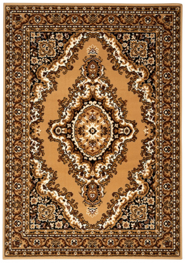 Béžový koberec z oblíbené řady Teheran udělá parádu v obývacím pokoji či ložnici. Může se pyšnit orientálním vzorem se zdobným medailonem uprostřed, který pomáhá vytvořit elegantní a tradiční atmosféru. Koberec má zvýšenou odolnost oproti poškození mechanického typu a promáčknutí, a to díky pevnému a příjemnému polypropylenu. Barva koberce je stálá, koberec je obšitý po celém obvodu a má antistatickou úpravu.
