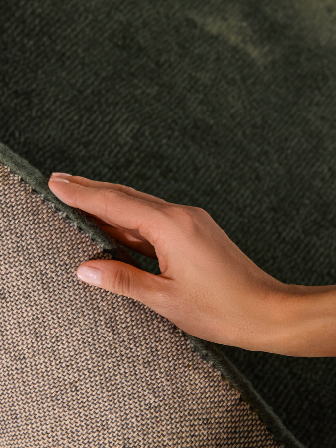 Tmavě zelený koberec v nepravidelném kruhovém tvaru vnese do interiéru špetku hravosti i uklidňující přírodní atmosféru. Jeho měkké křivky působí uvolněně a originálně, zatímco zvýrazněné okraje dodávají celku jemný dekorativní akcent. Směs vlny a nylonu zajišťuje příjemný, měkce pružící povrch, který zároveň odolá každodennímu používání. Textura kombinující smyčky a nízký střižený vlas přináší moderní vzhled a lehkost, zatímco přirozené tlumení zvuku a hřejivé vlastnosti materiálu vytvářejí útulné prostředí.