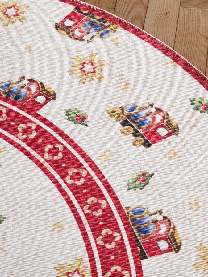Tento kulatý koberec vás na první pohled zaujme veselým motivem vláčku, který se vyjímá uprostřed a působí hravě i pohádkově. Jeho červeno-modré barvy krásně ladí s celkovým svátečním laděním a připomínají radostné chvíle spojené s Vánoci a dárky. Koberec má namísto klasického vlasu potisk, takže se velmi snadno udržuje. Je součástí speciální kolekce vytvořené k 15. výročí značky Villeroy & Boch a je dostupný pouze v rámci limitované edice pro sezónu 2025/2026. Stává se tak nejen krásným vánočním doplňkem, ale i exkluzivním sběratelským kouskem.