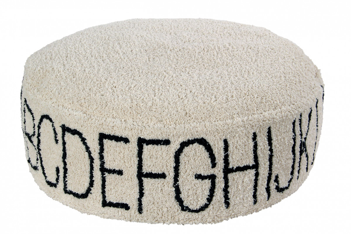 Ručně tkaný kulatý sedací vak ABC má přírodní základ a po obvodu černá písmena abecedy. Horní a boční část je pokryta měkkým plyšovým povrchem, spodní část z bavlněného plátna a vak je opatřen zipem pro snadné vyjmutí a praní potahu. Vnitřní výplň z polystyrenových kuliček umožňuje tvarovat vak podle potřeby. Ideální do dětských pokojů jako pohodlné sedadlo i dekorativní prvek.